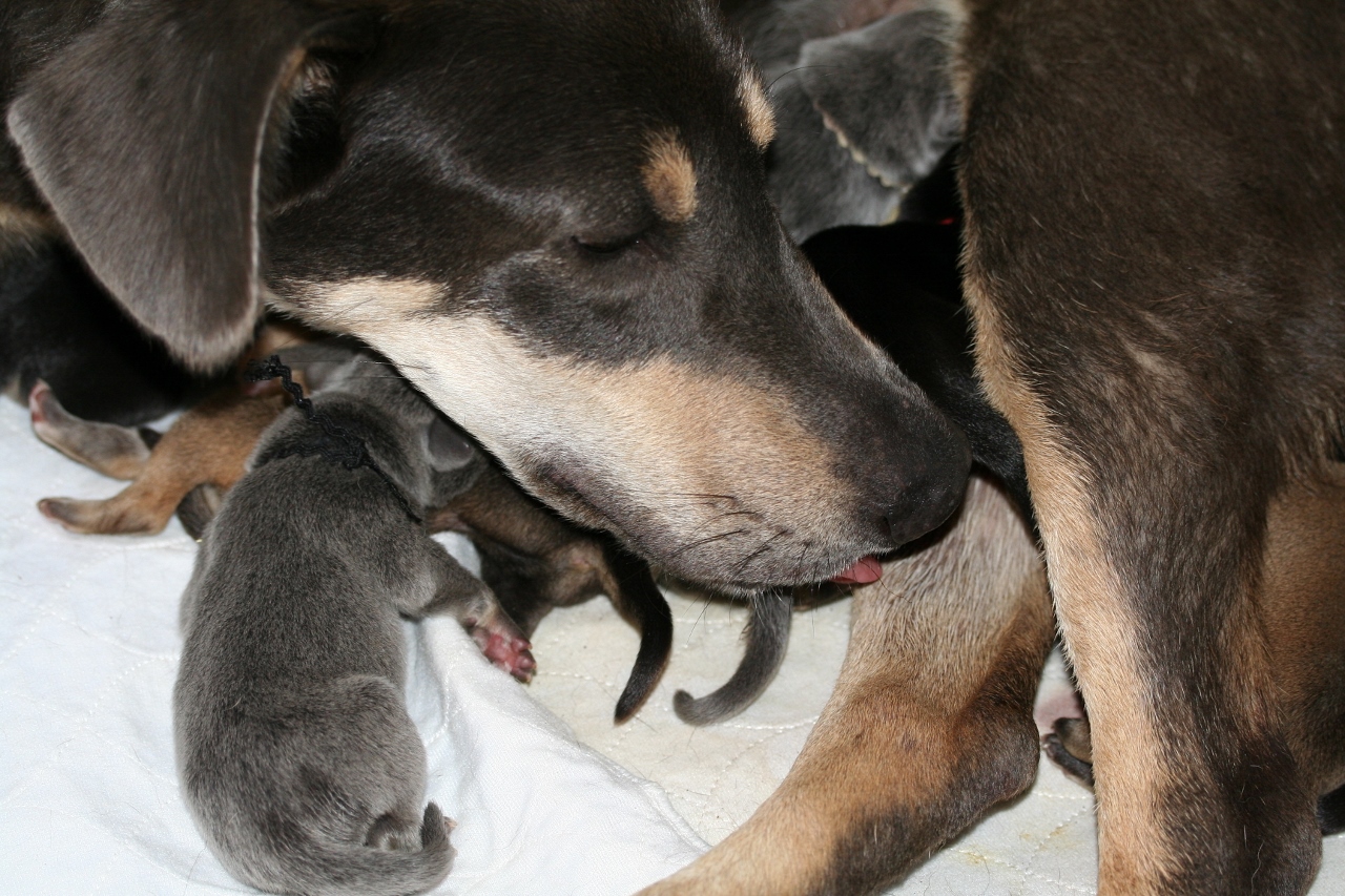 Here we are already at four weeks old. The puppies are growing like weeds now that they are transitioning to solid food. Their teeth have come in, as shown by their desire to chew on things from each other and toys to the kittens. My female kitten, Freyja, has taken up the mantle of puppy nanny, spending most of her time with them. She actually keeps them in line more than Reine does, letting them know when they get too rough. The weekly photo shoot was quite a challenge between several uncooperative puppies, and the kitten being either in the photo or on my back. In a few days they will move into their new, larger enclosure with easy access to the great outdoors.