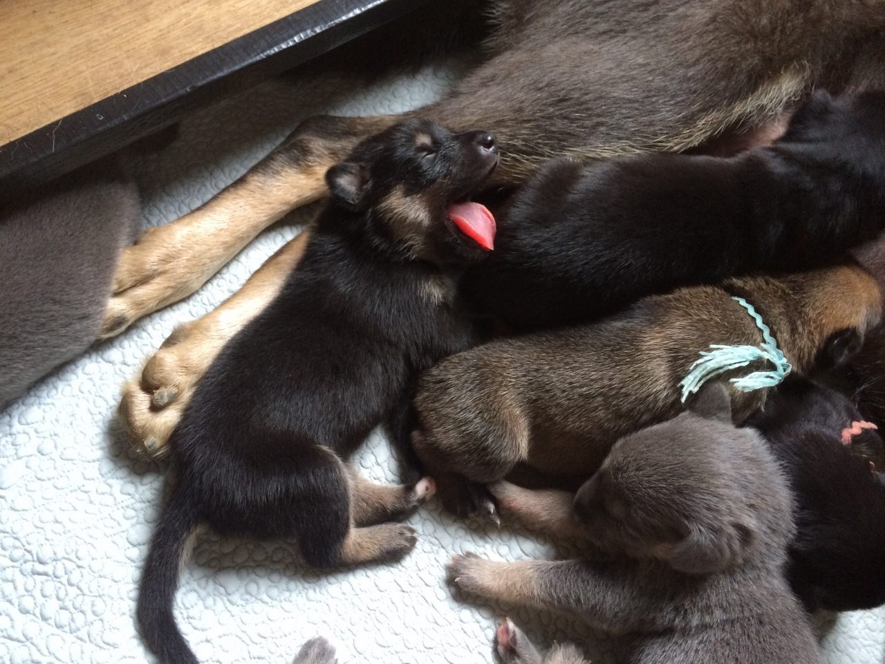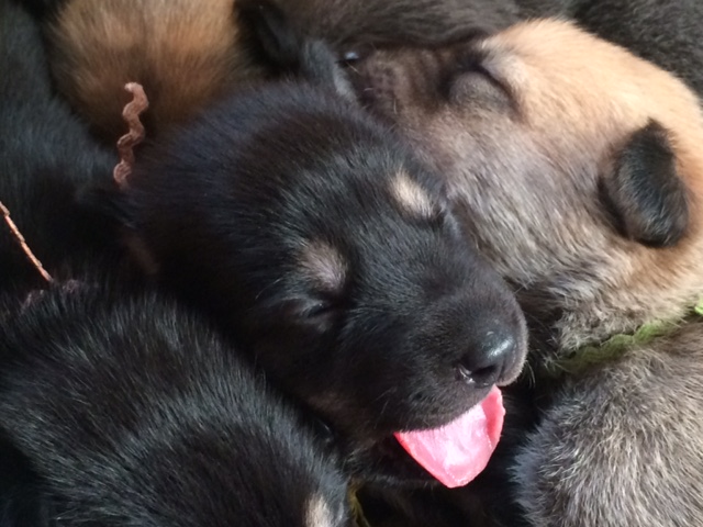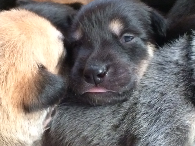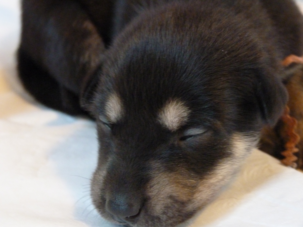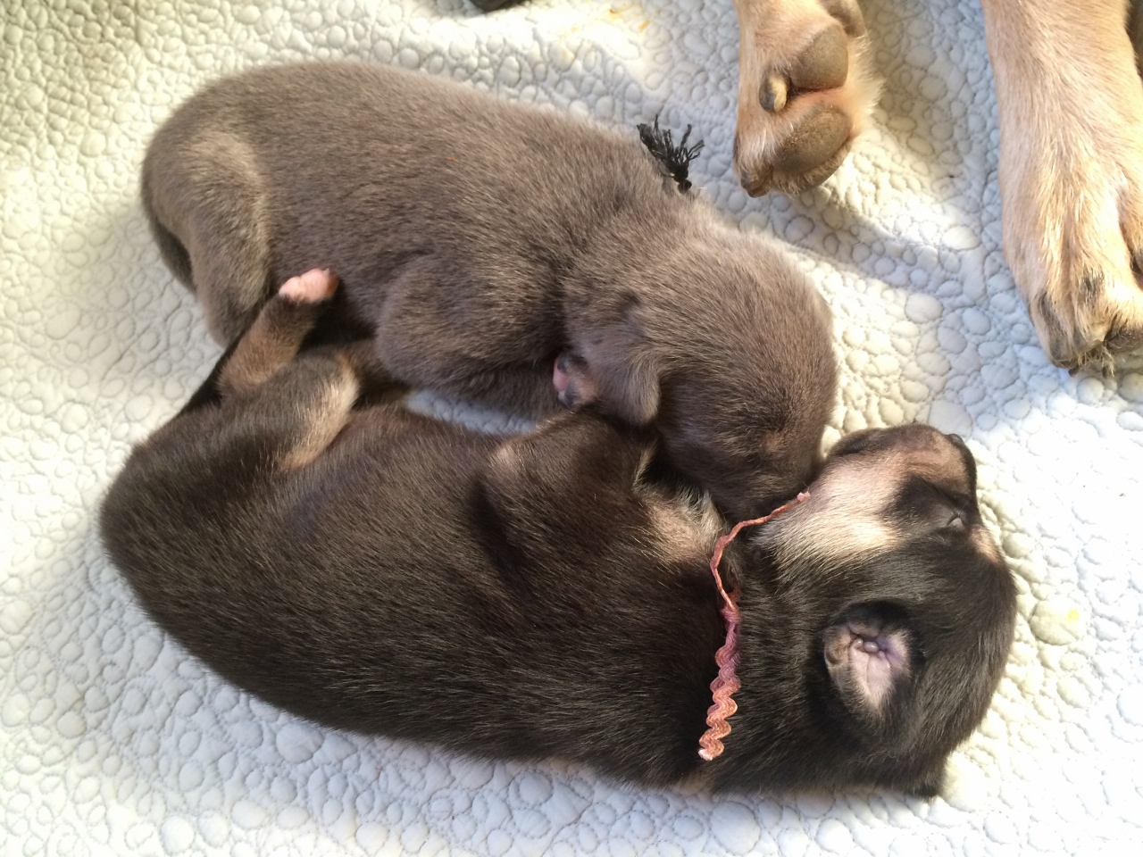 The end of the second week has been marked by big changes for the puppies. The eyes of all the pups are now fully open. This has encouraged them to start to interact with their litter mates, and explore the limits of the whelping box. More and more they rise up on all wobbly four legs and attempt to walk, only to fall into a heap. They endure nail trimming, grooming, photo shoots, and other little stresses with copious amounts of squealing. Enjoy the sometimes blurry images that mark their second week and see how much they have grown.