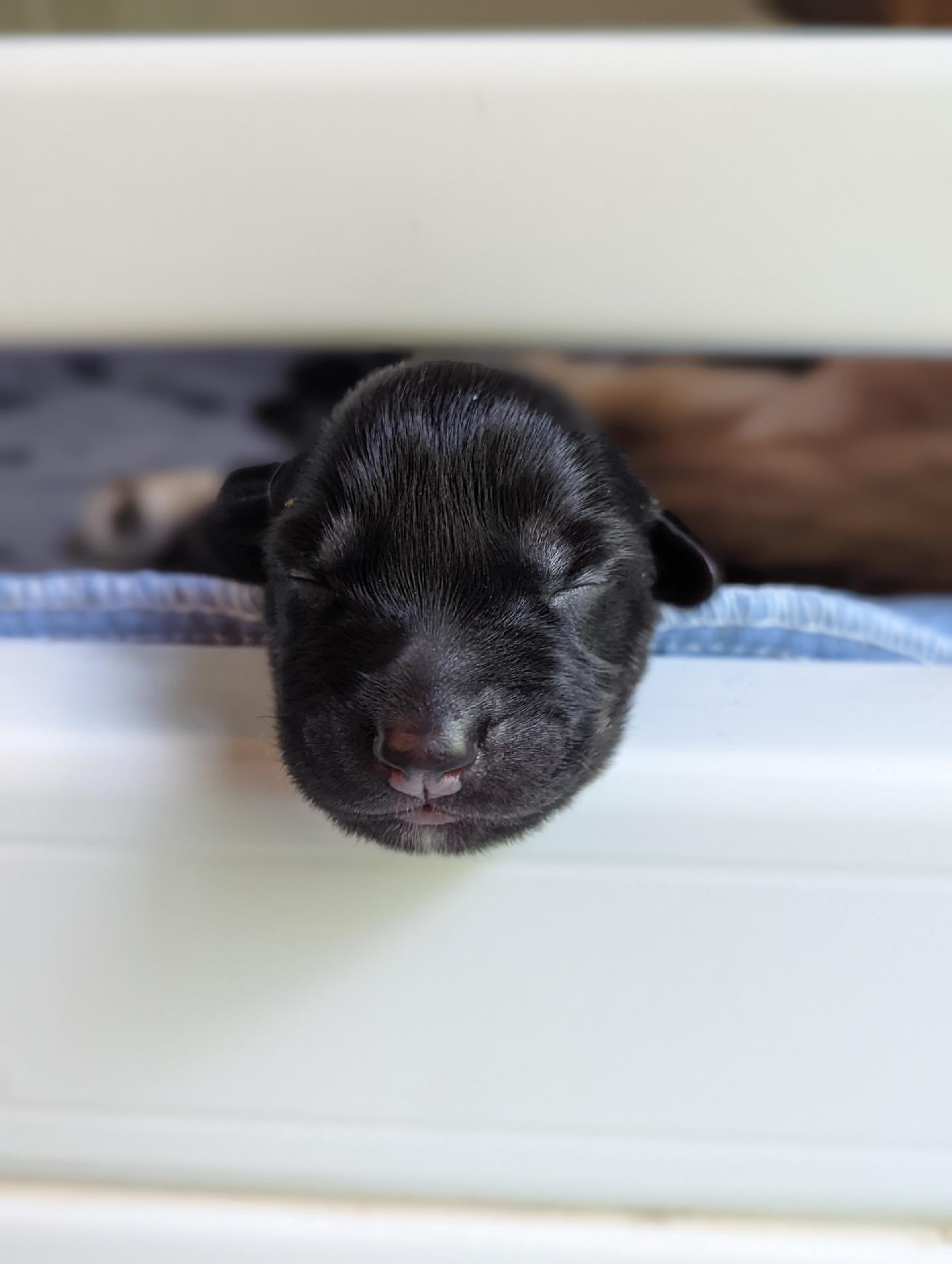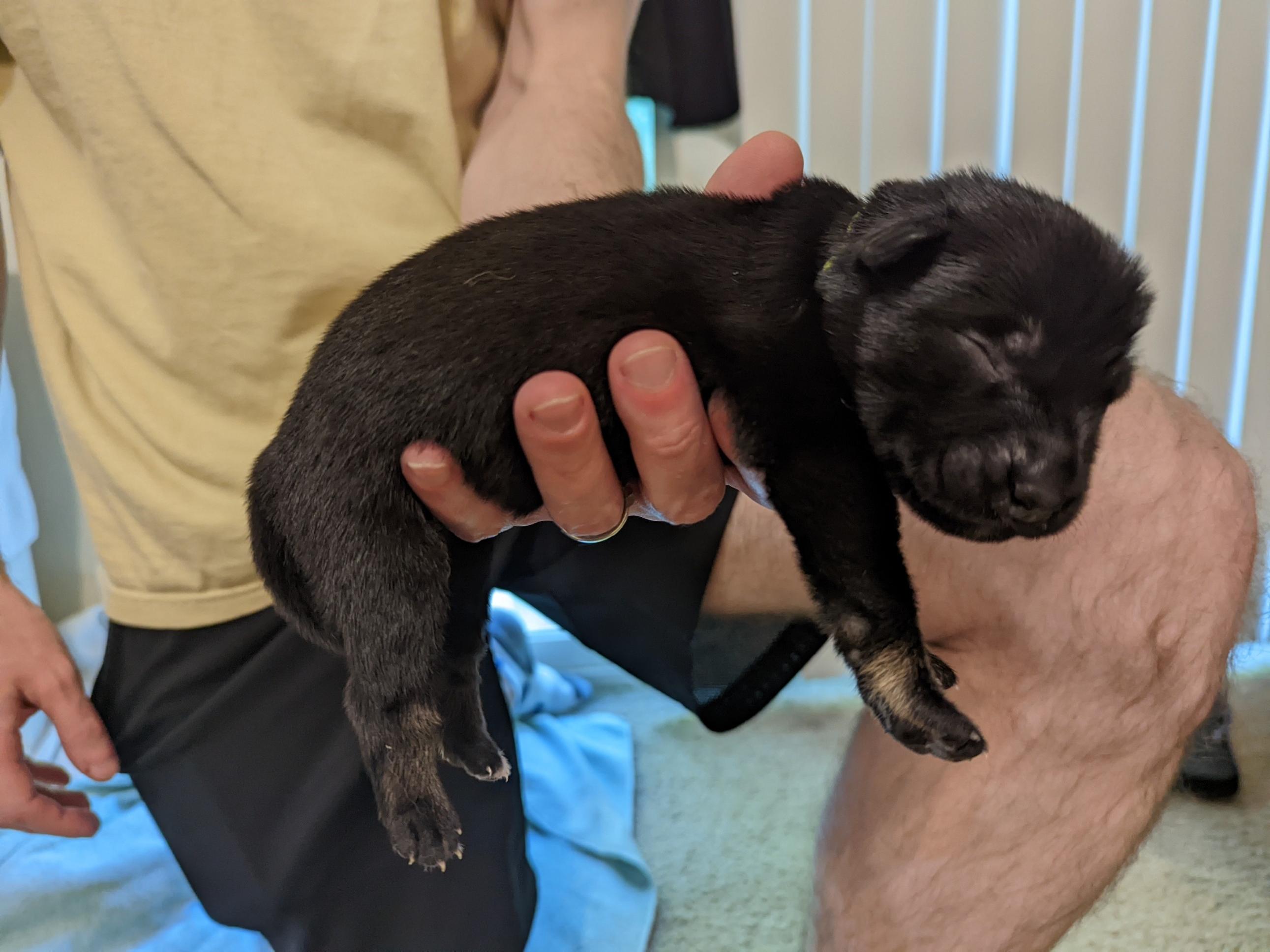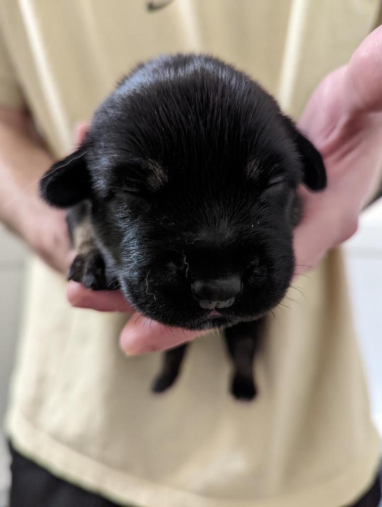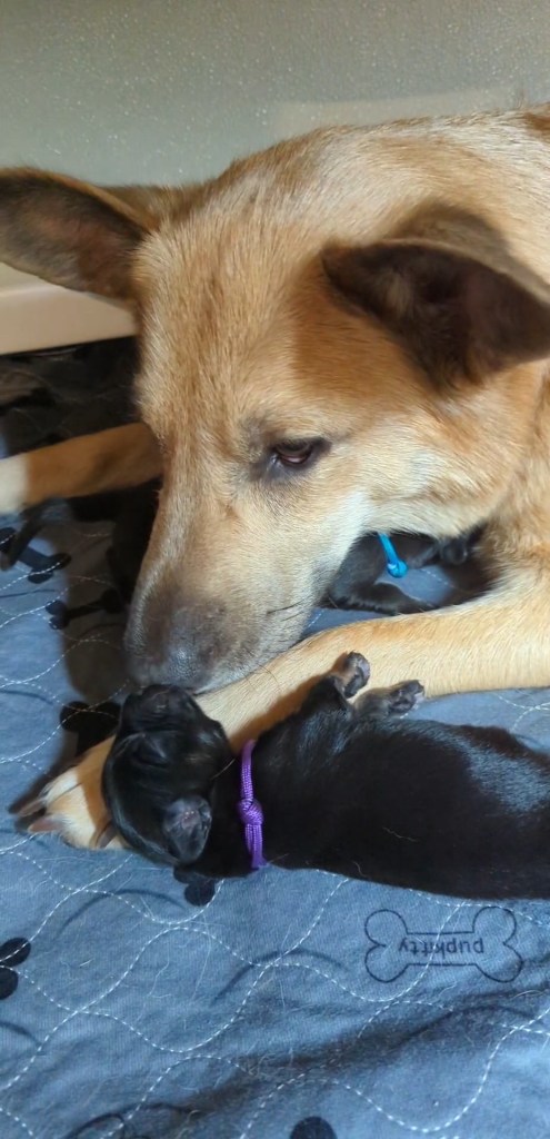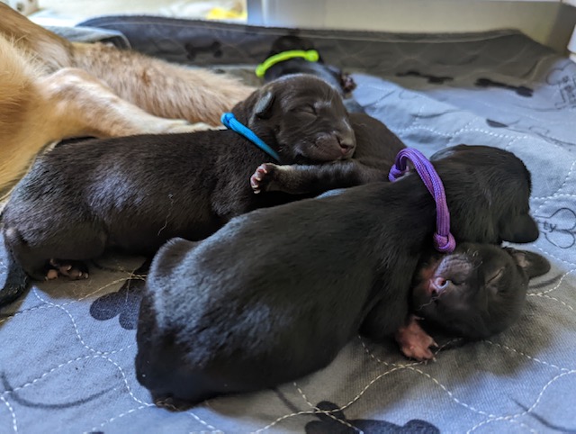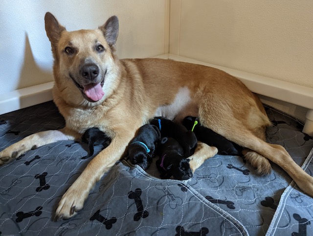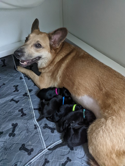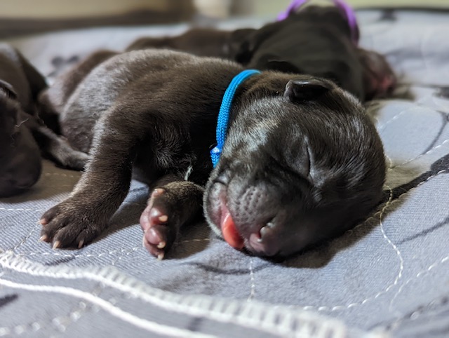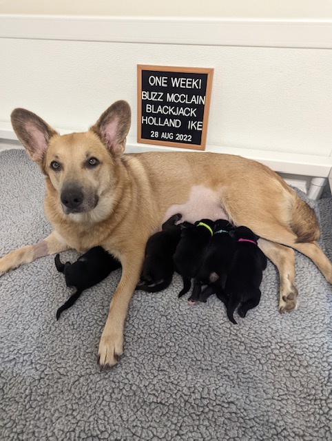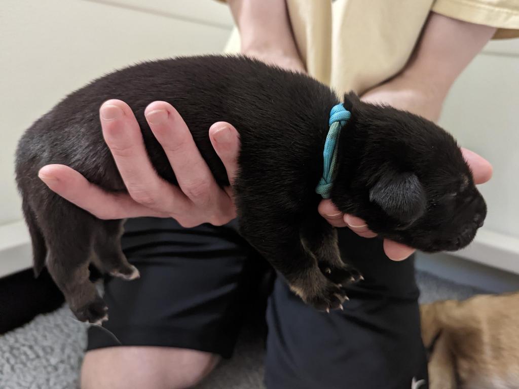 Pups are already one week old and growing quickly. They have all double their birth weight, including Ike, who had a slow and tenuous beginning. Willow is being a great and doting mom with them. Even though they can’t walk yet they manage to move around the whelping box with amazing ability. They are also getting quite vocal, and their tan points are becoming more evident.
