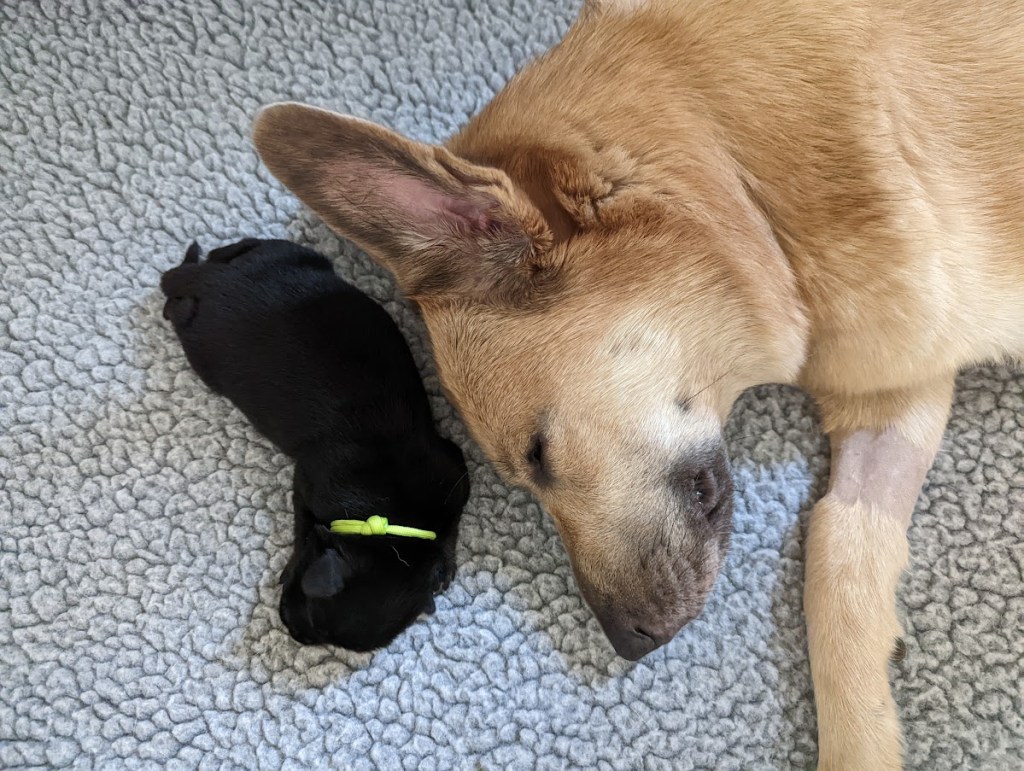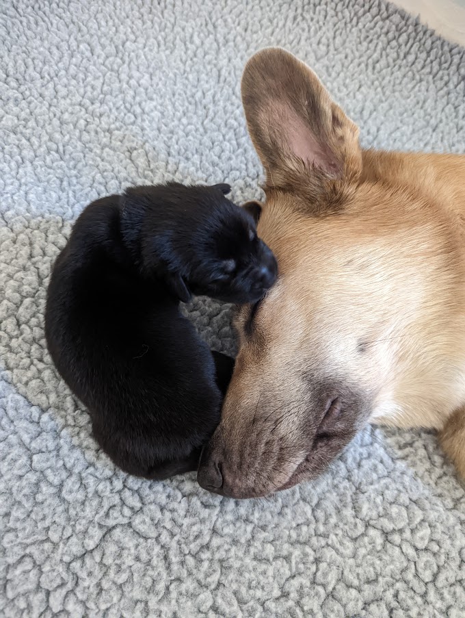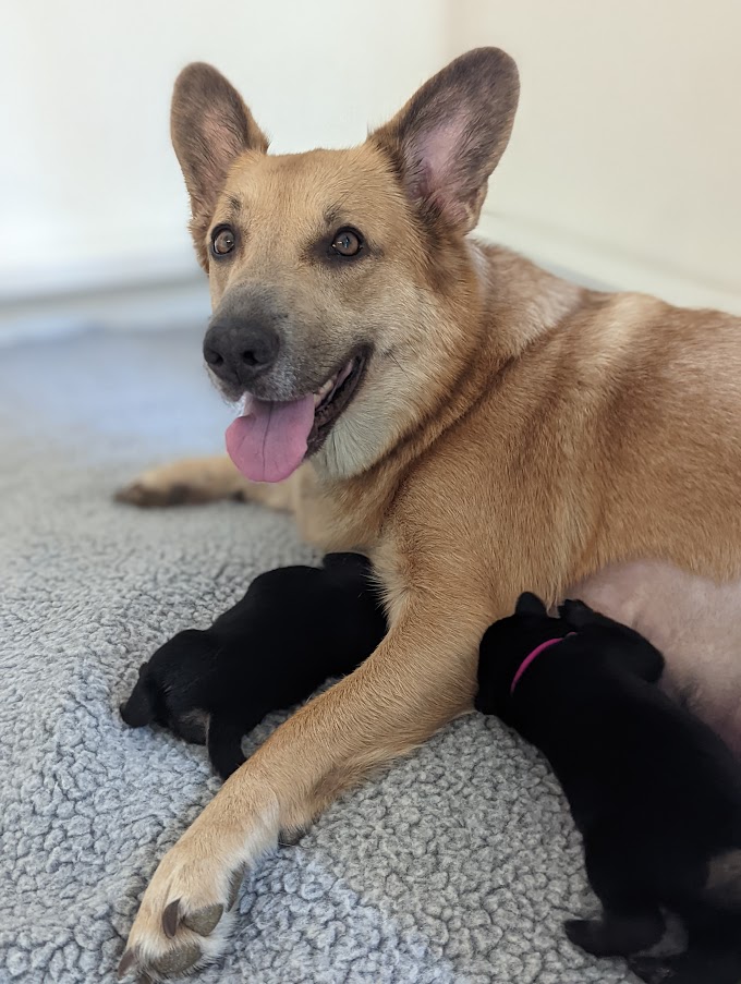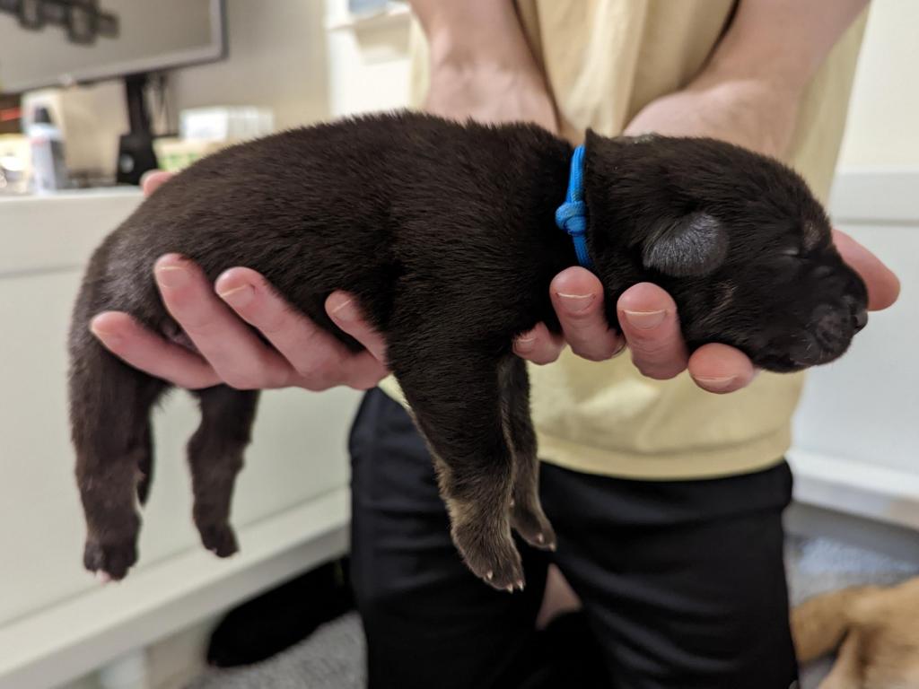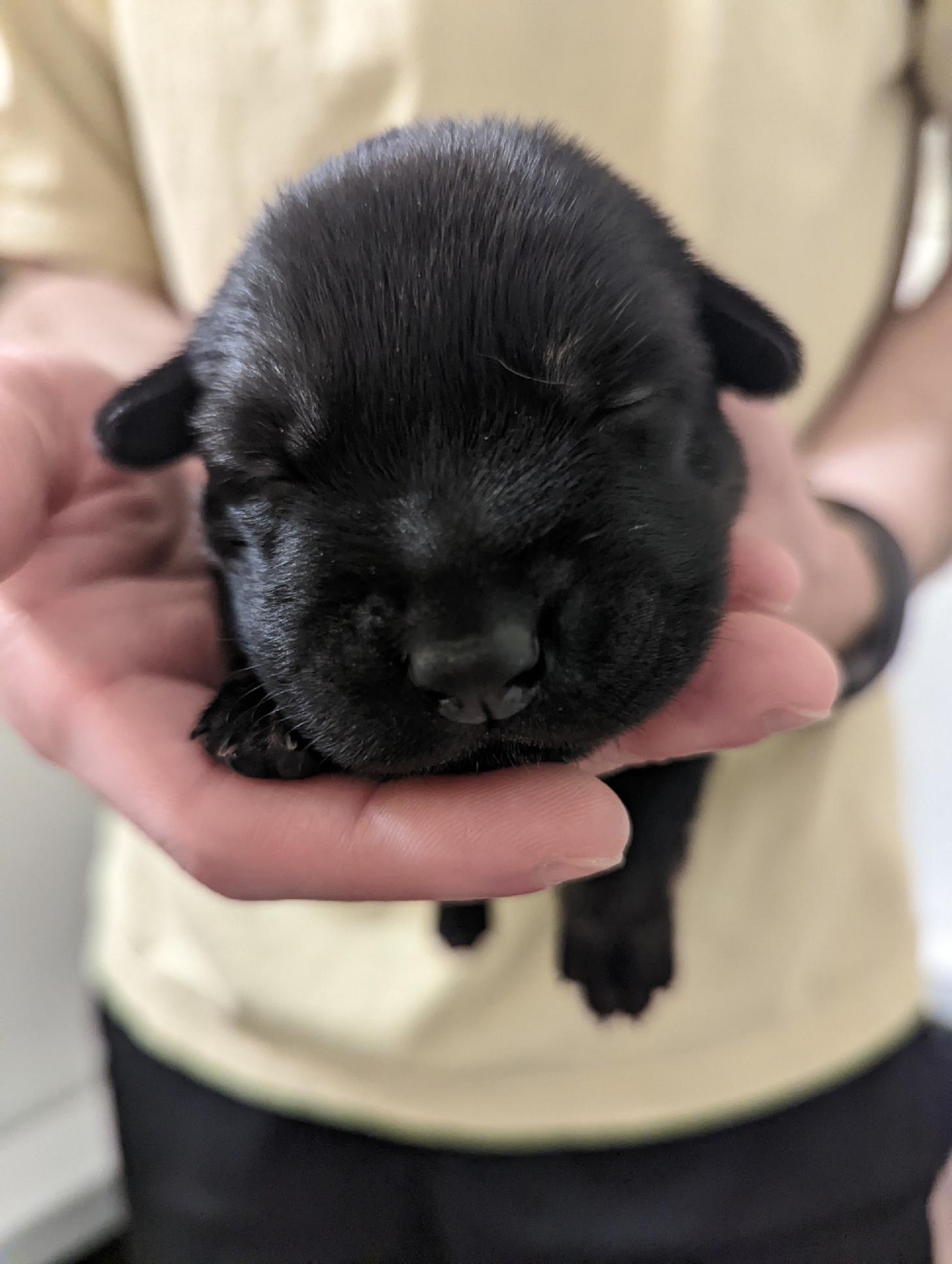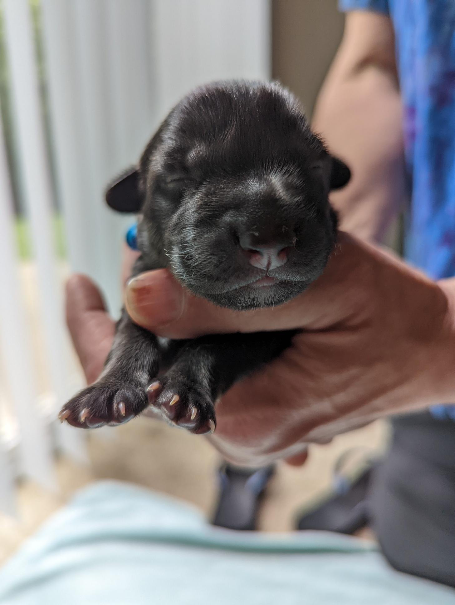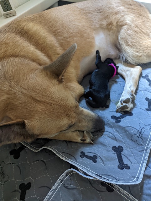 Pups are already one week old and growing quickly. They have all double their birth weight, including Ike, who had a slow and tenuous beginning. Willow is being a great and doting mom with them. Even though they can’t walk yet they manage to move around the whelping box with amazing ability. They are also getting quite vocal, and their tan points are becoming more evident.