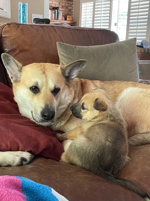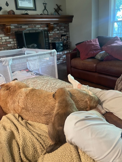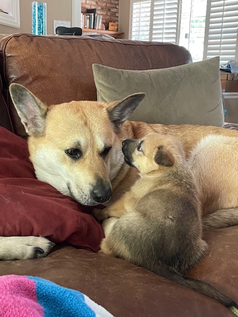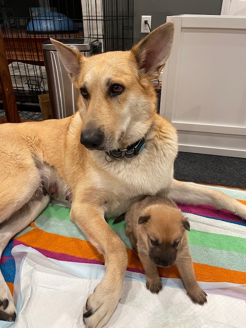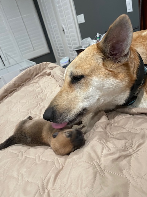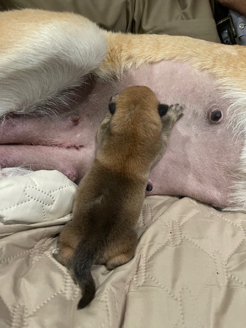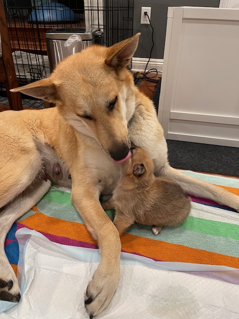 JJ was born via C-Section and weighed in at 12.5 oz. She is named in honor of Jennifer Doudna, CRISPR research pioneer. Due to the C-section and anesthesia, Birdie did not accept her little pup right away. After a few days of diligent and creative work by her humans, Birdie became a devoted and loving mom.