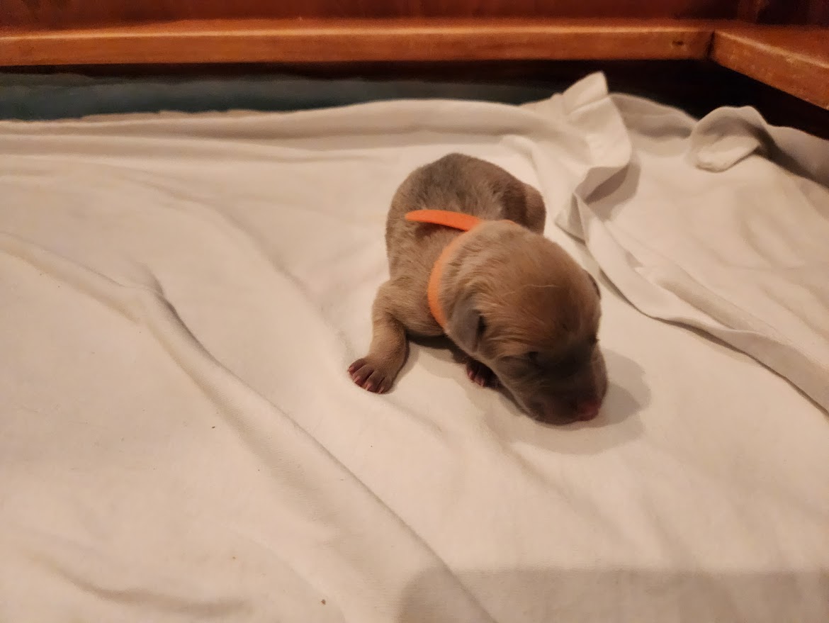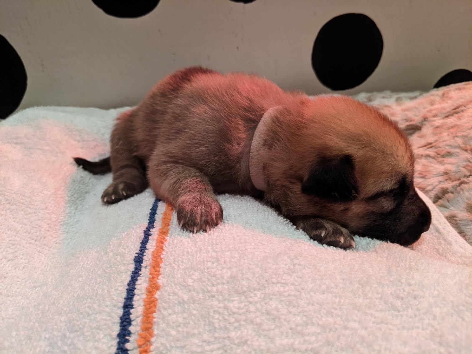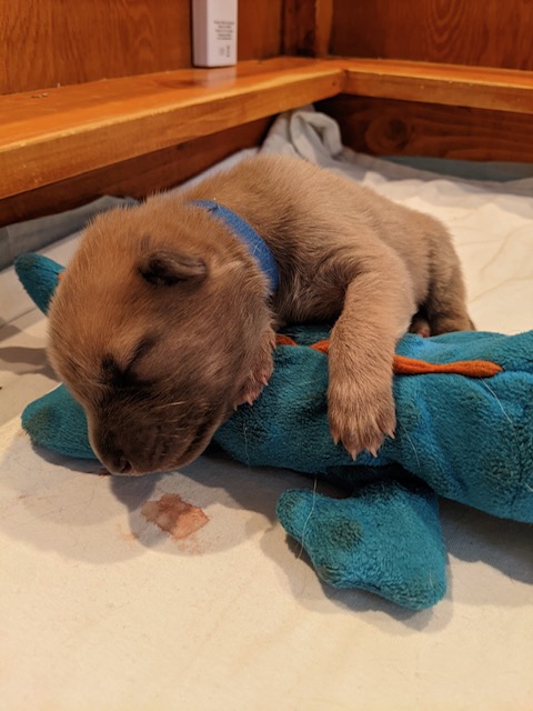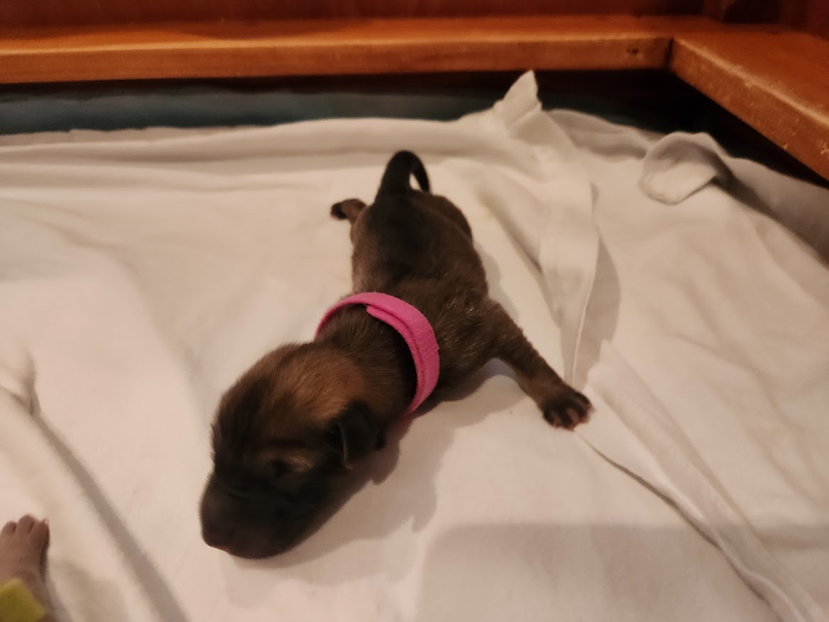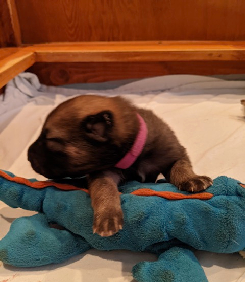 The puppies are growing well and Bona is being an excellent mom. It is always a little amazing to see these first-time moms know just what to do. Here are individual pictures of the wee ones and current weights (and collar colors with some changes). Today is daddy Tracker’s 5th birthday, so please wish him a Happy Birthday!