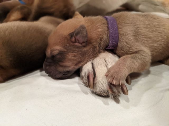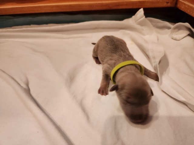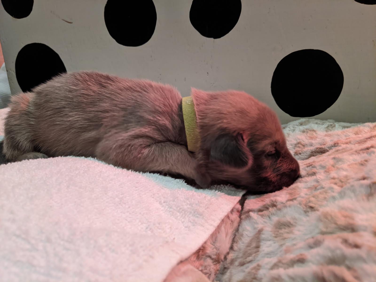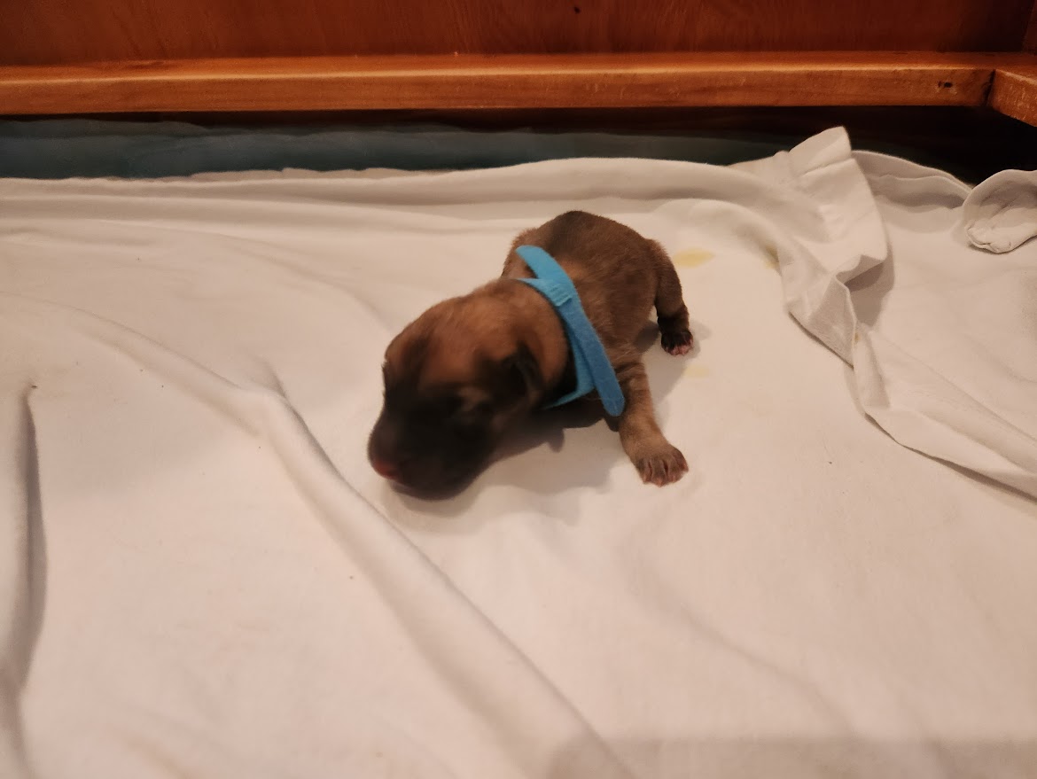 The puppies are growing well and Bona is being an excellent mom. It is always a little amazing to see these first-time moms know just what to do. Here are individual pictures of the wee ones and current weights (and collar colors with some changes). Today is daddy Tracker’s 5th birthday, so please wish him a Happy Birthday!