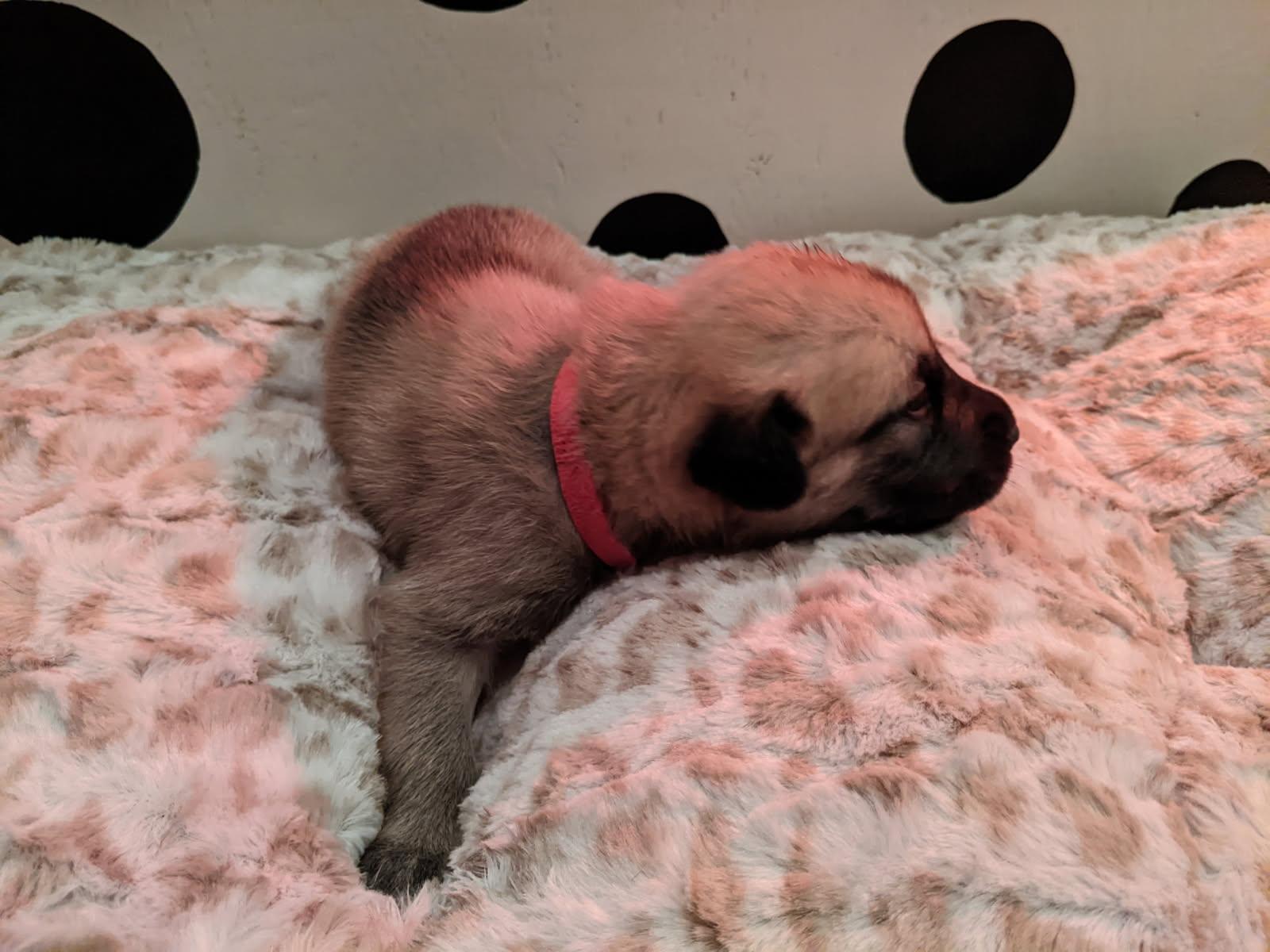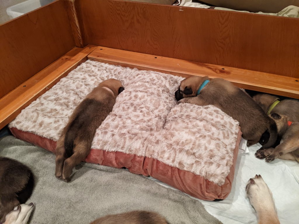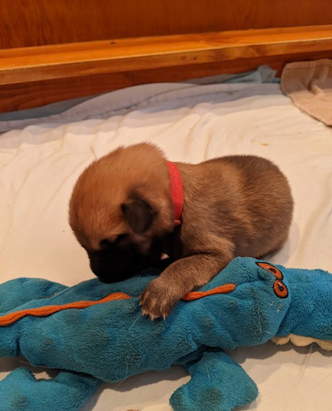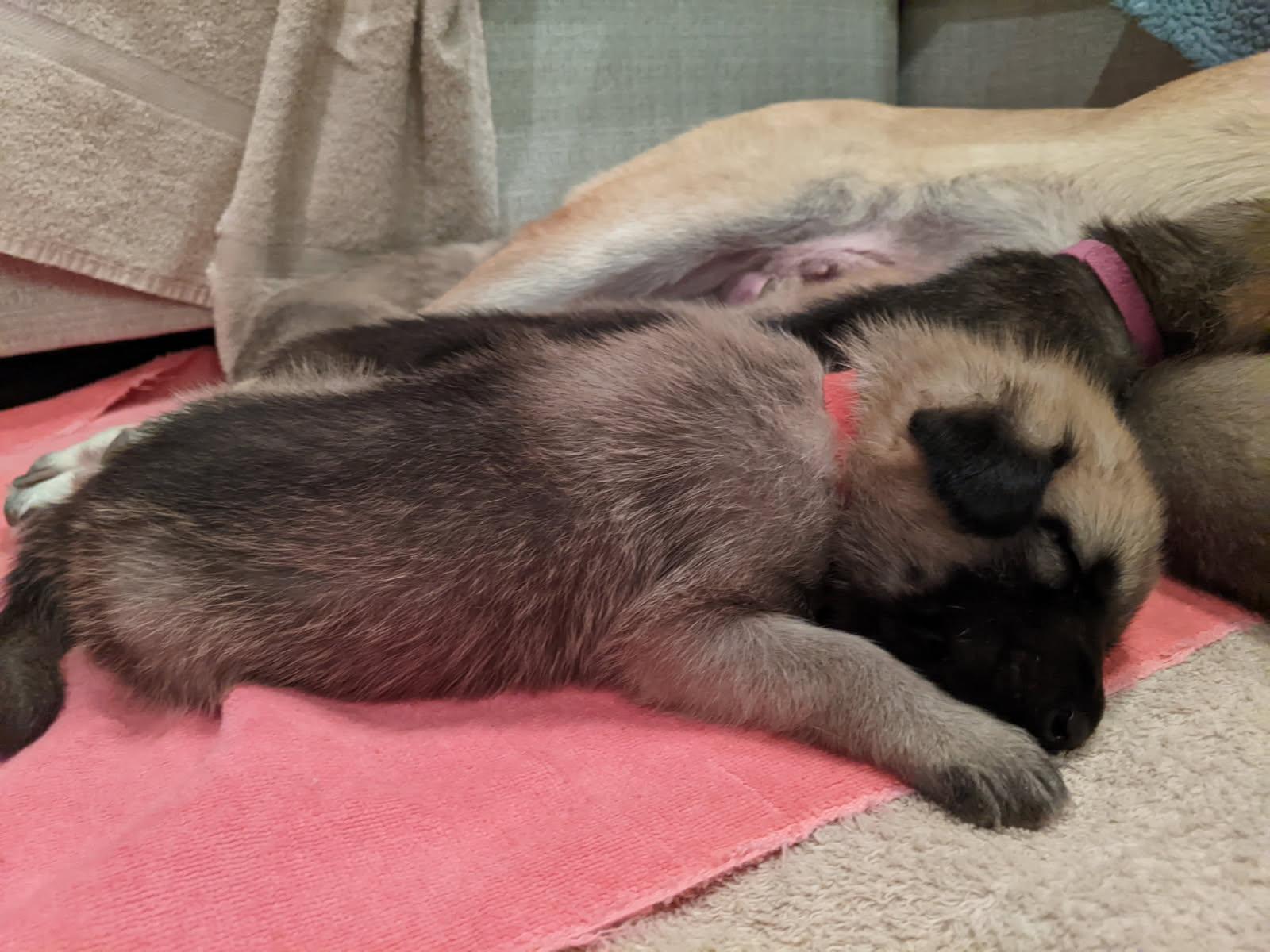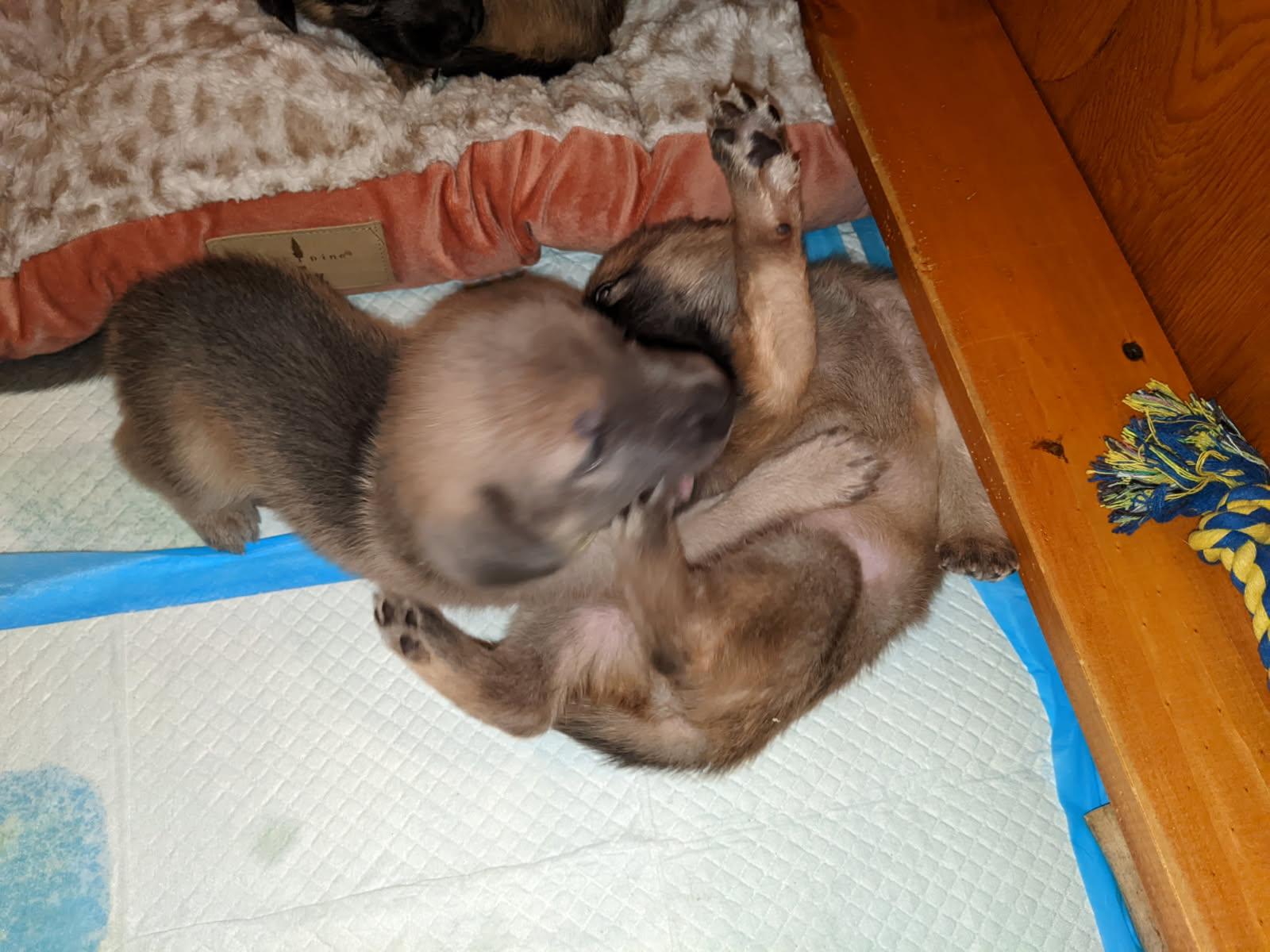 The pups continue to have good weight gains and Bona is being such a good mom. They are increasing their play with each other and are more interested in toys all the time. They are playing hard, then sleeping a lot. They have just been introduced to goats milk and are figuring out that new experience.