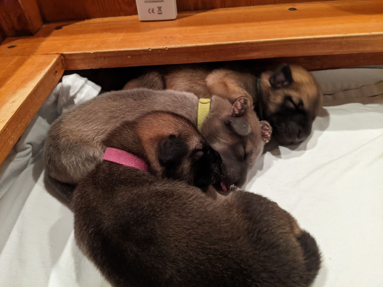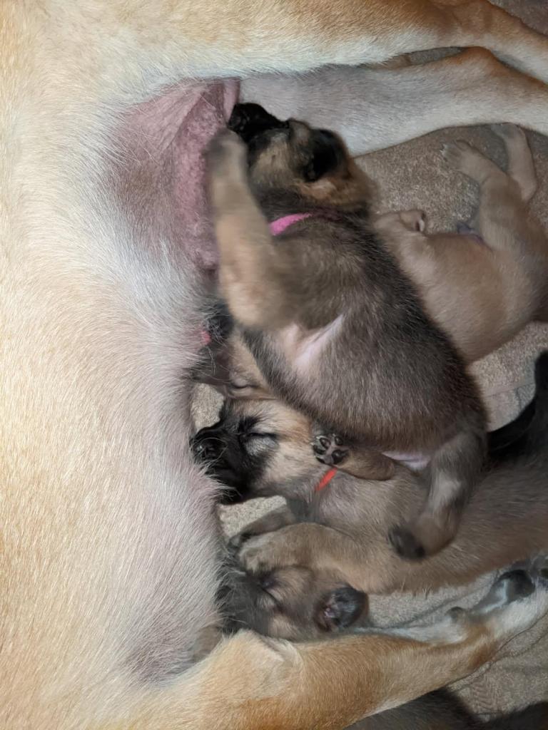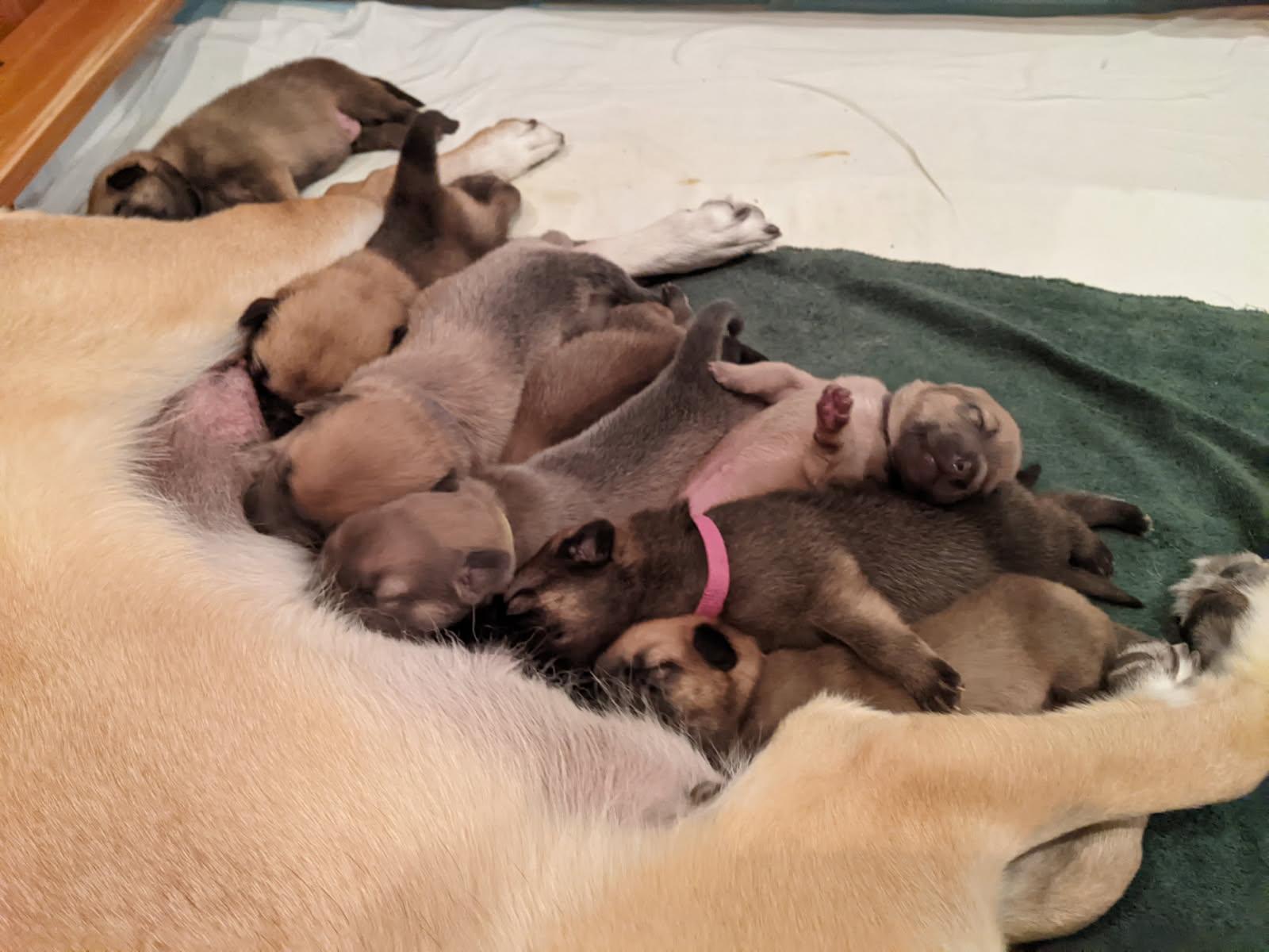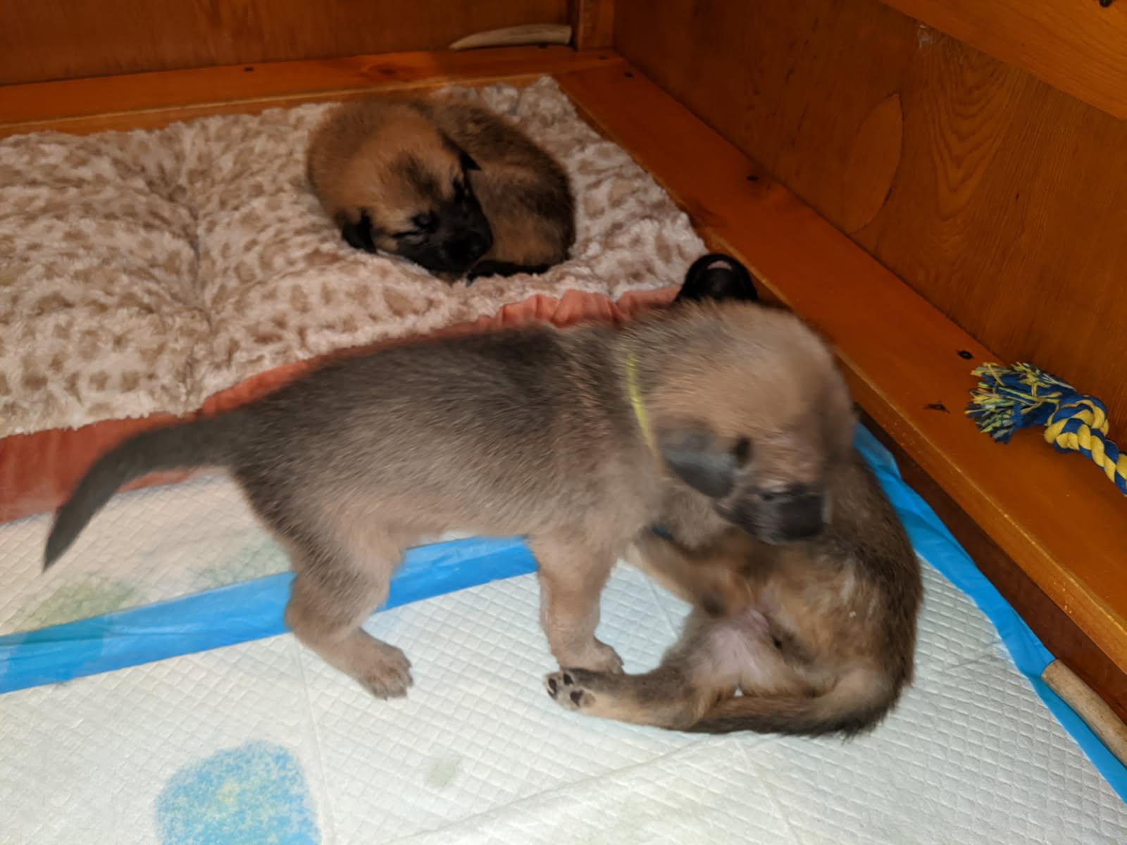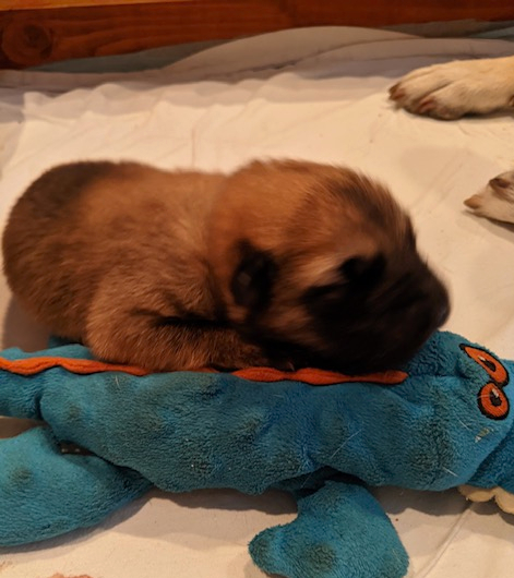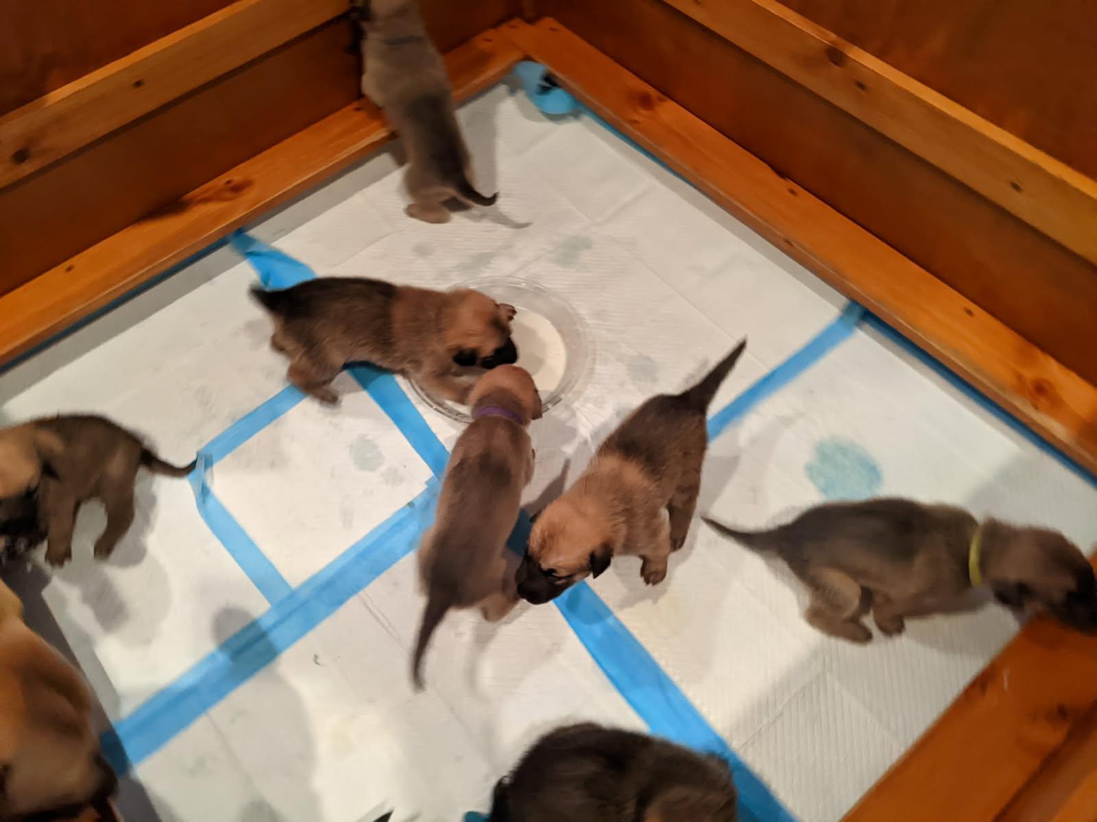 The pups continue to have good weight gains and Bona is being such a good mom. They are increasing their play with each other and are more interested in toys all the time. They are playing hard, then sleeping a lot. They have just been introduced to goats milk and are figuring out that new experience.