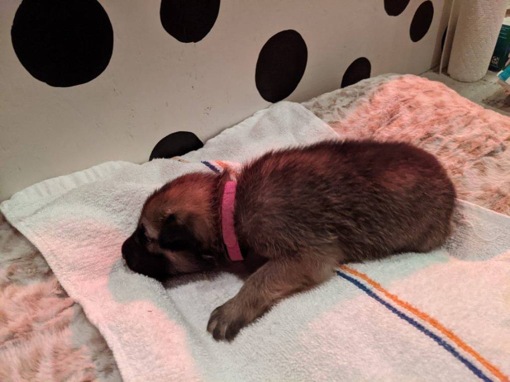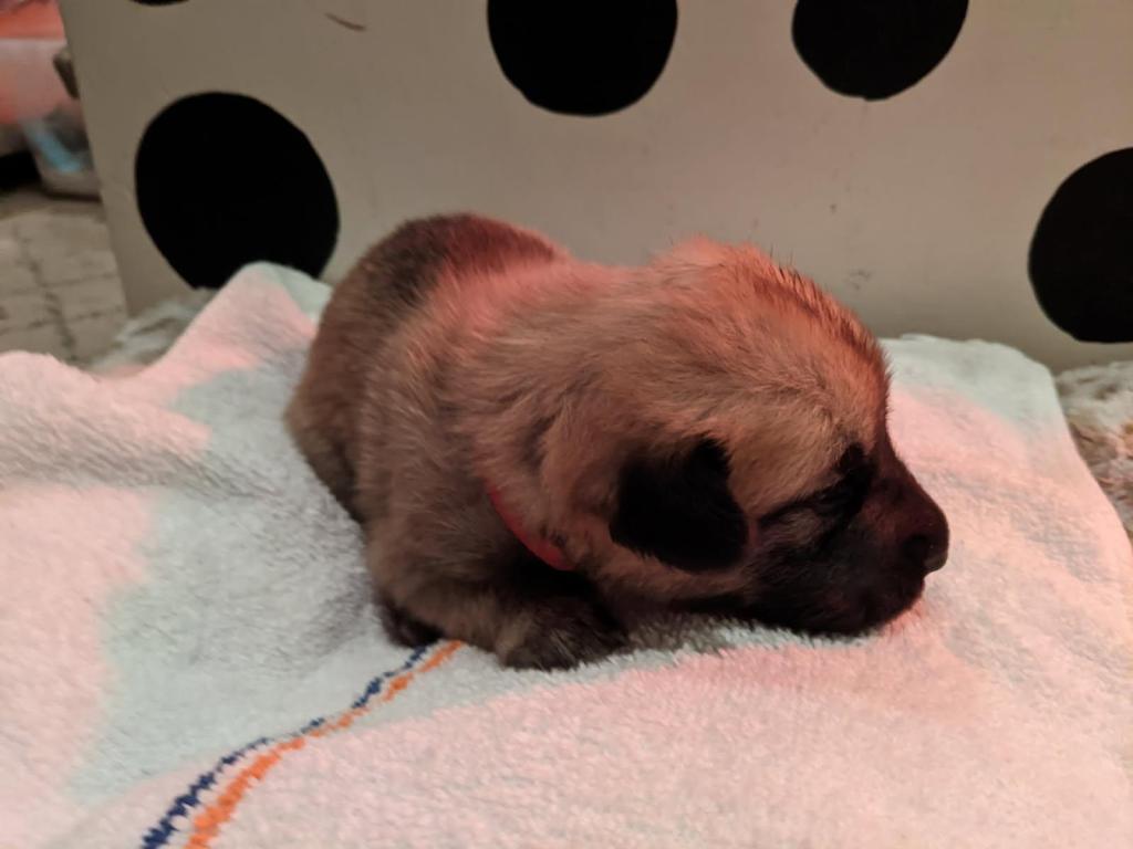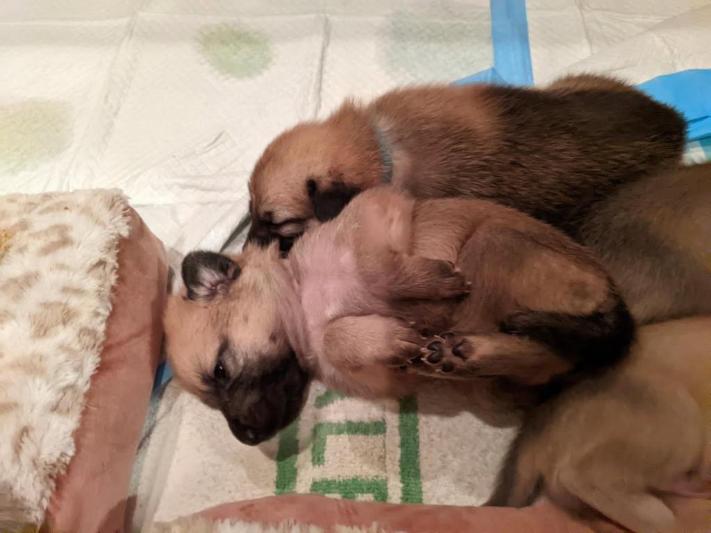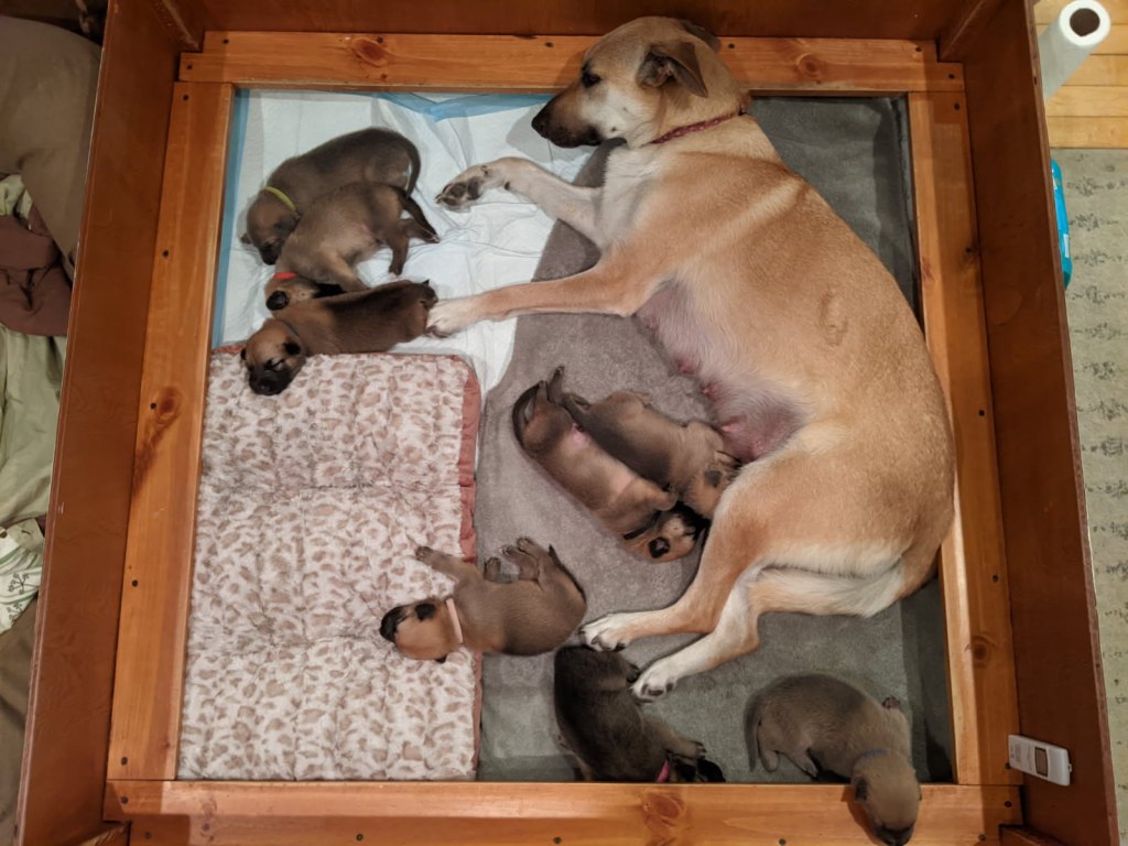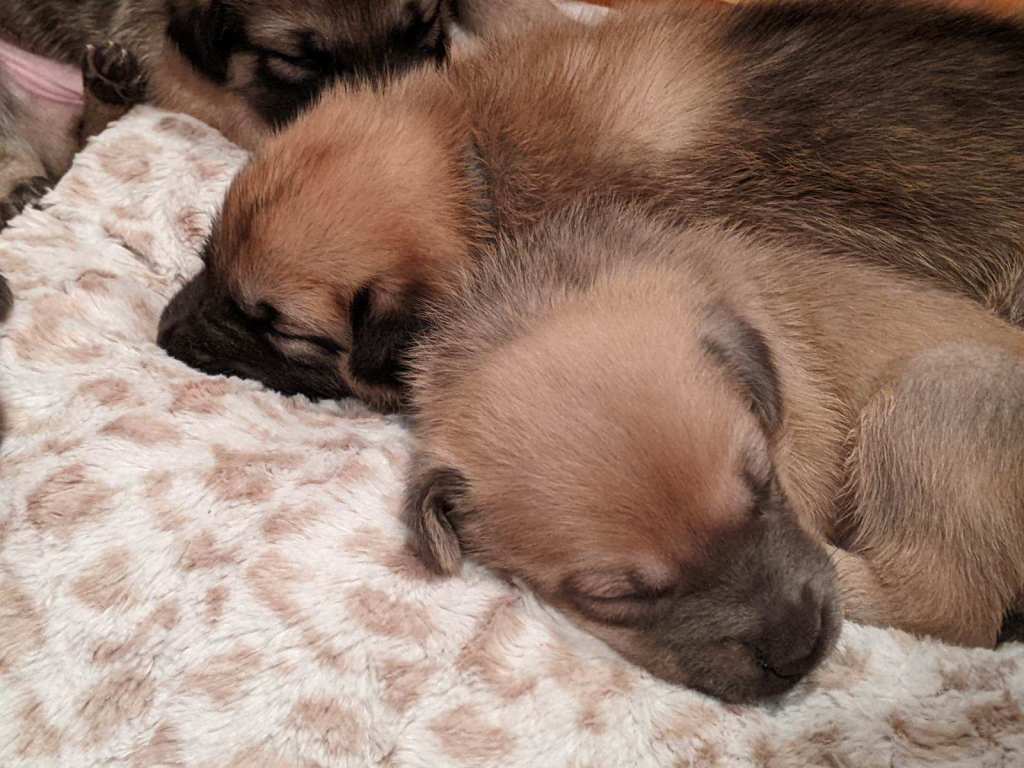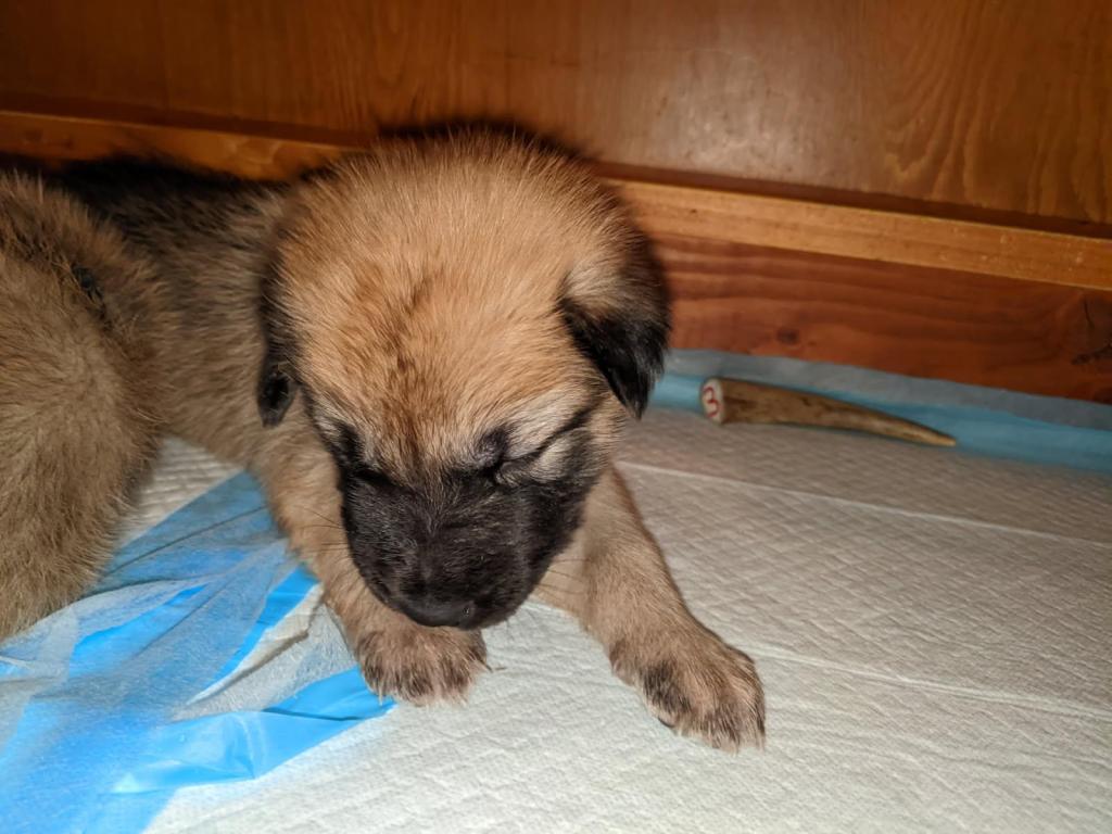 The pups continue to have good weight gains and Bona is being such a good mom. They are increasing their play with each other and are more interested in toys all the time. They are playing hard, then sleeping a lot. They have just been introduced to goats milk and are figuring out that new experience.