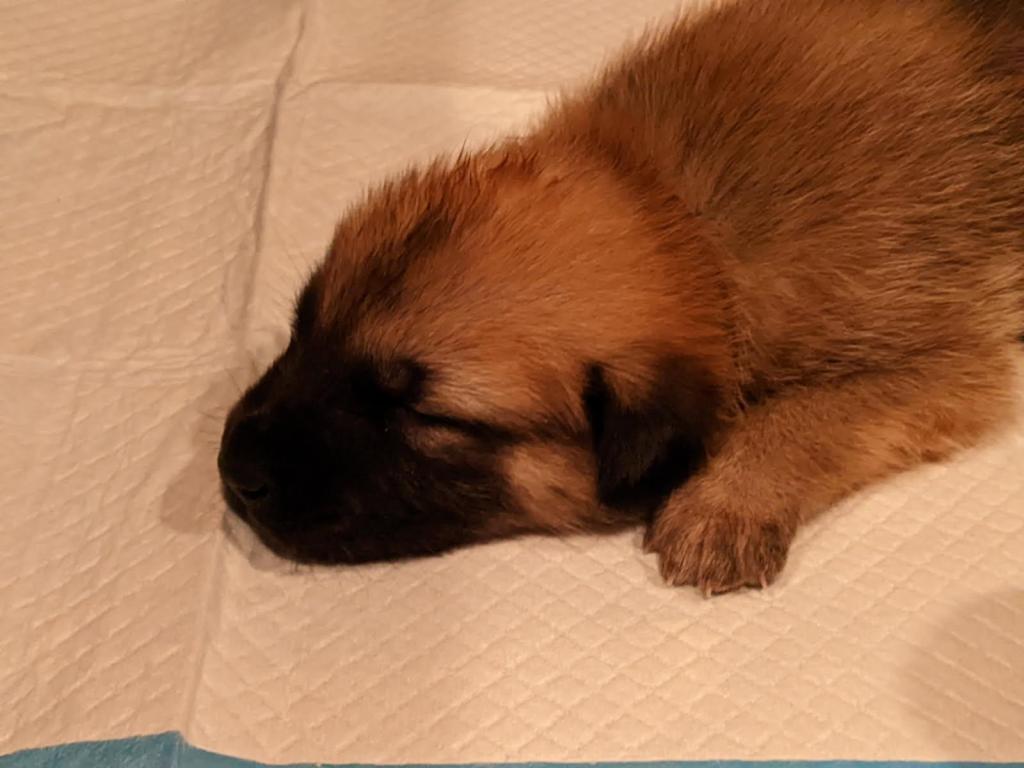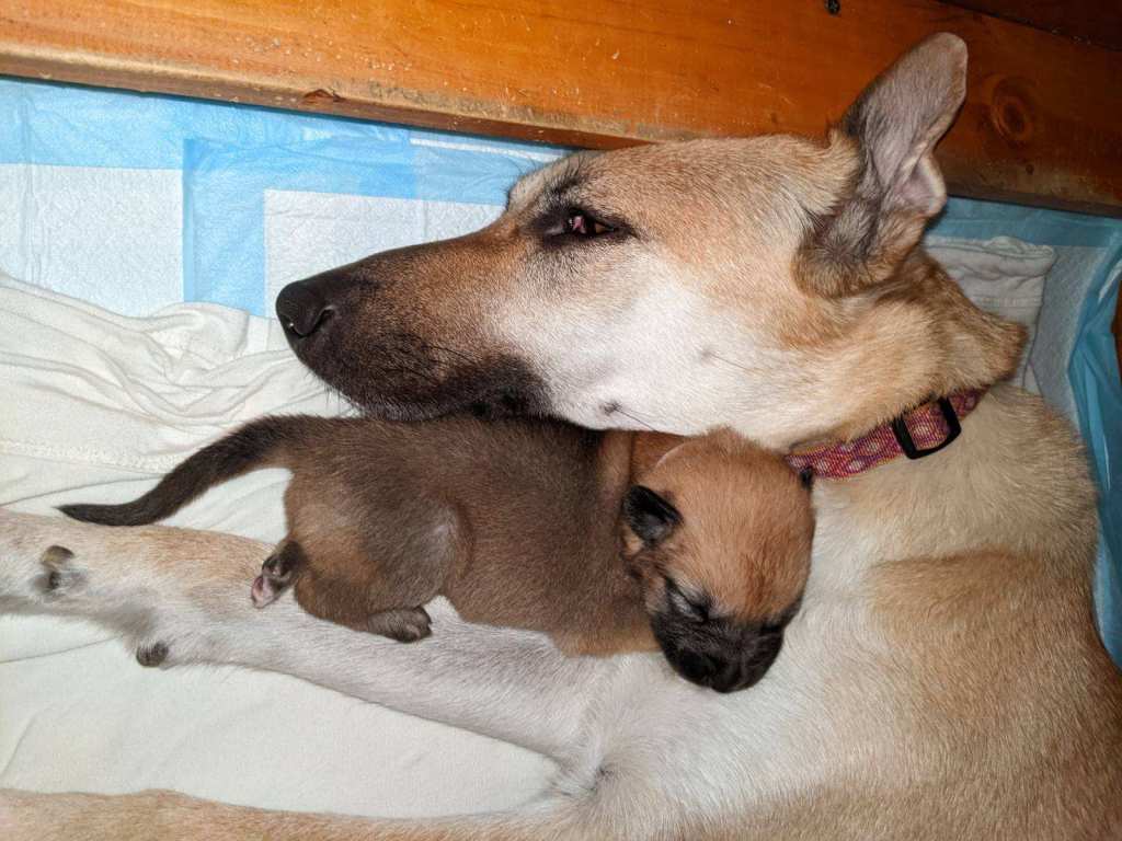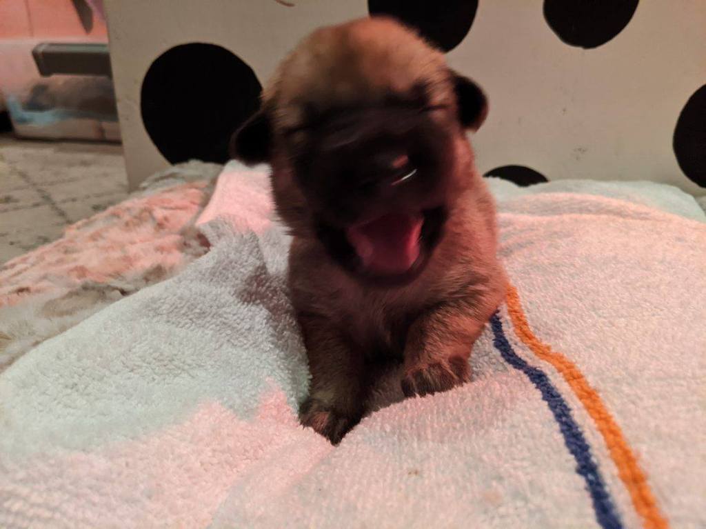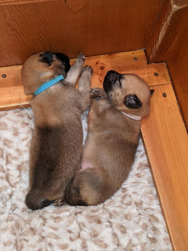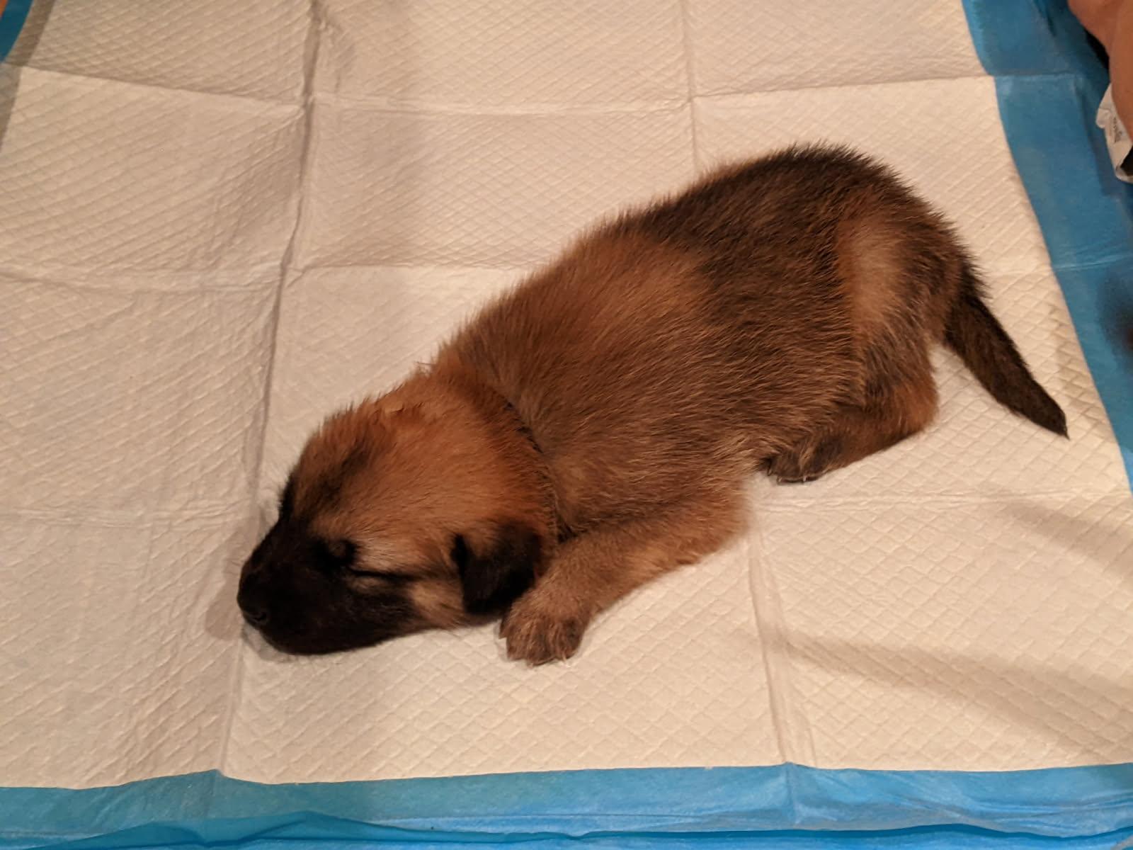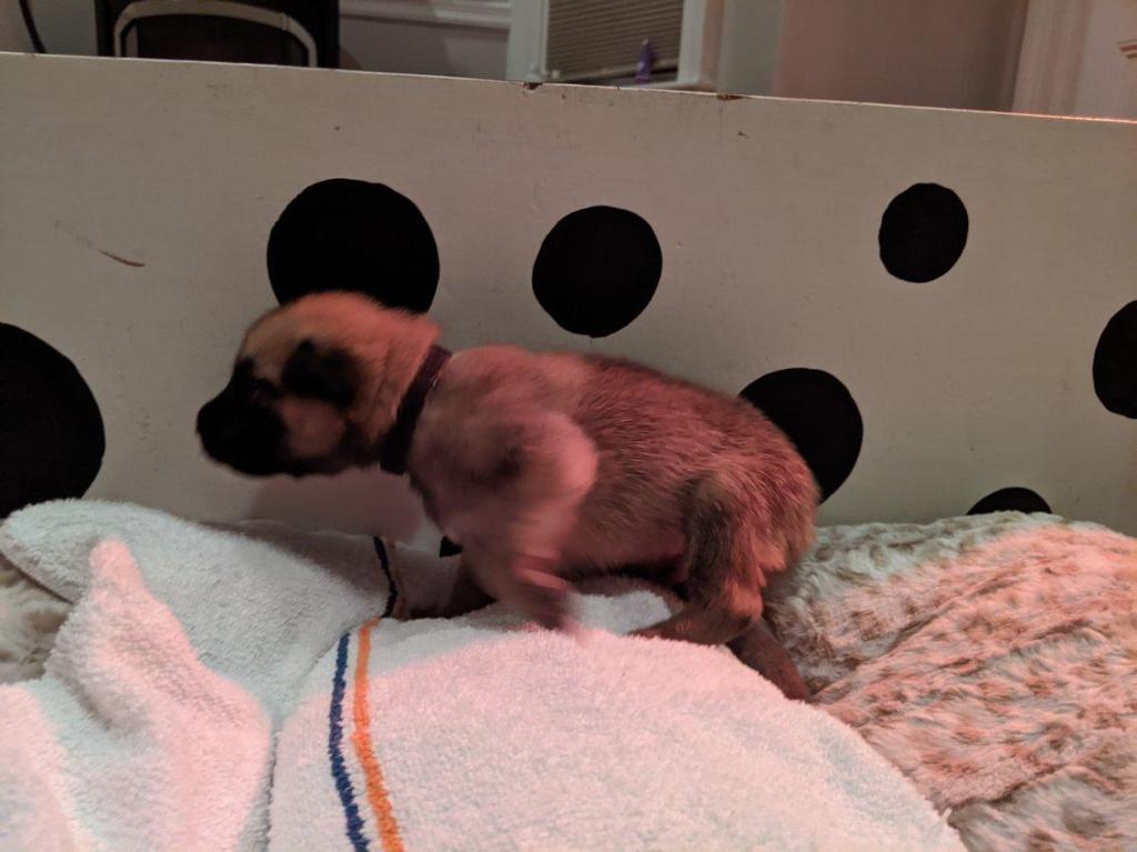 The pups continue to have good weight gains and Bona is being such a good mom. They are increasing their play with each other and are more interested in toys all the time. They are playing hard, then sleeping a lot. They have just been introduced to goats milk and are figuring out that new experience.