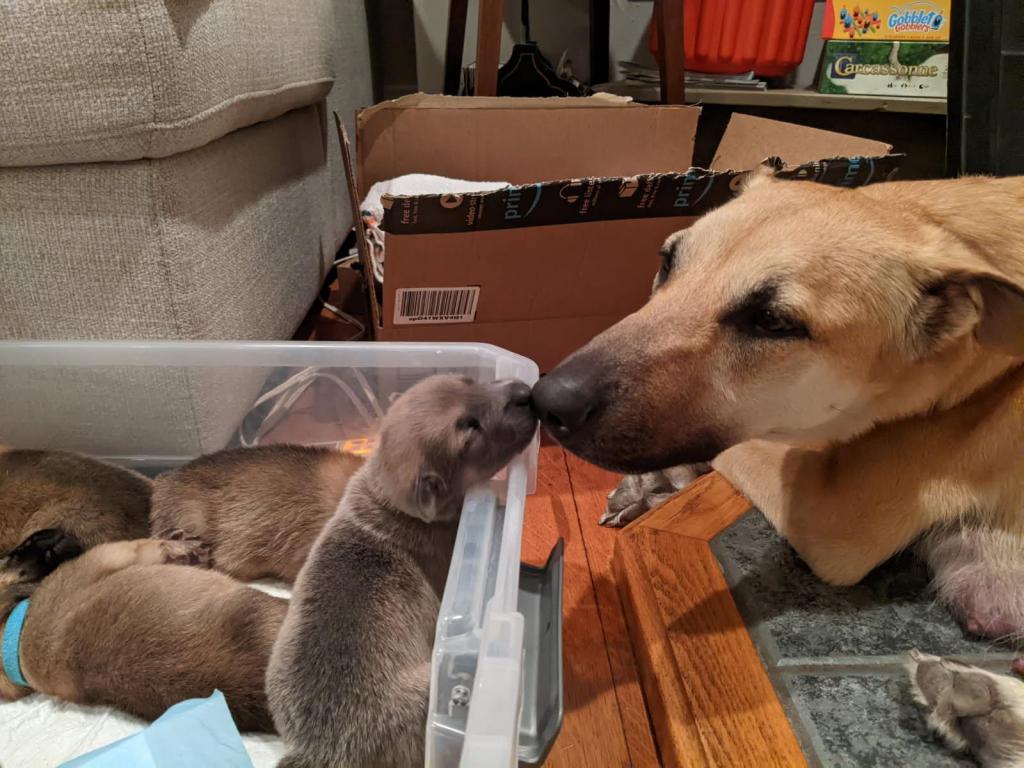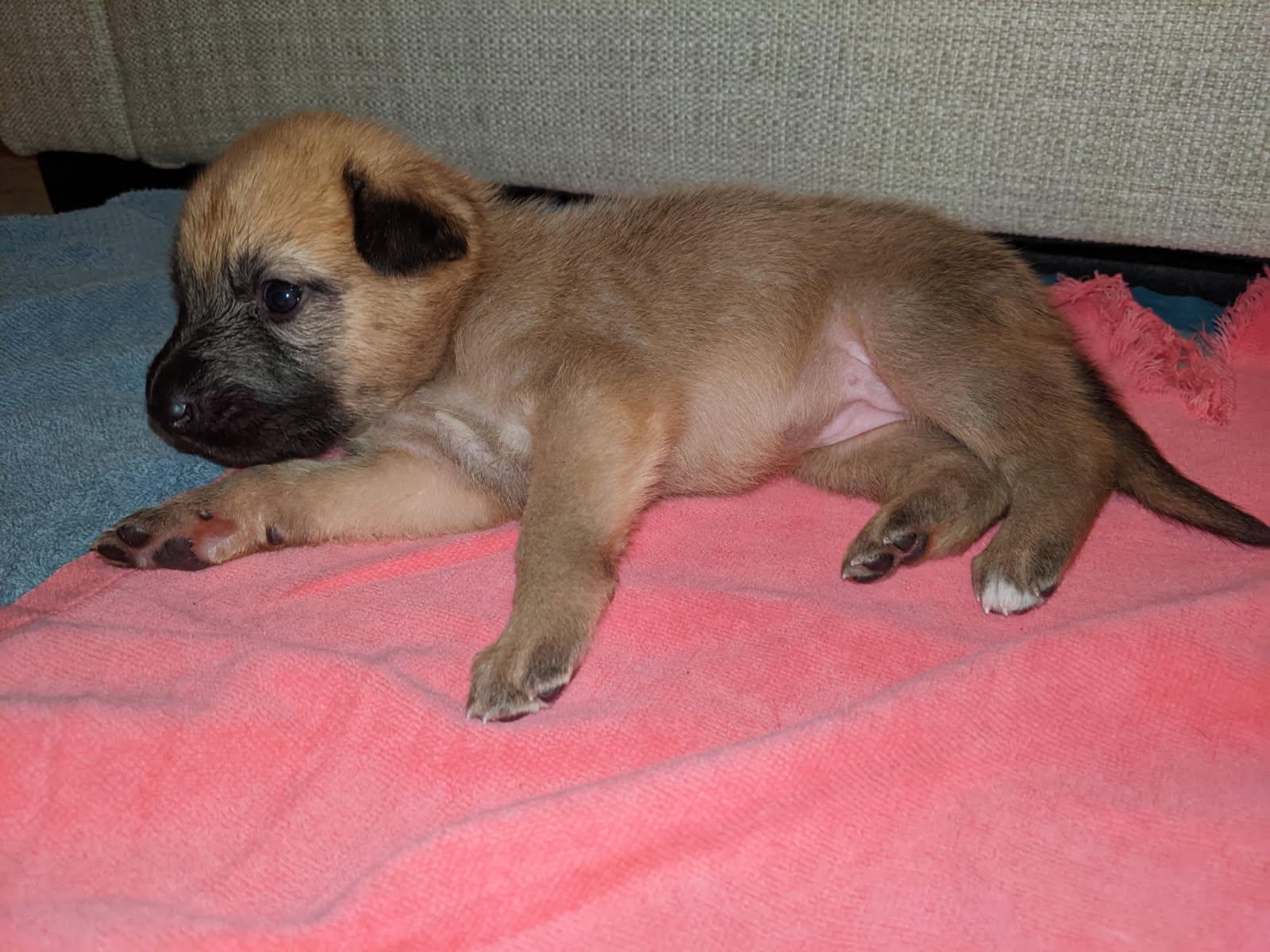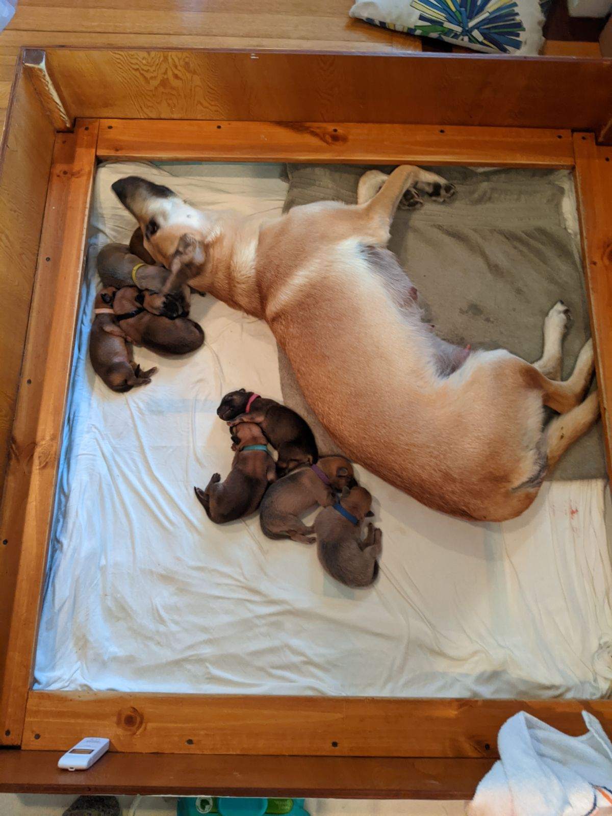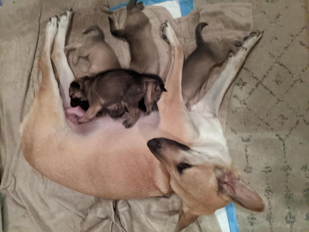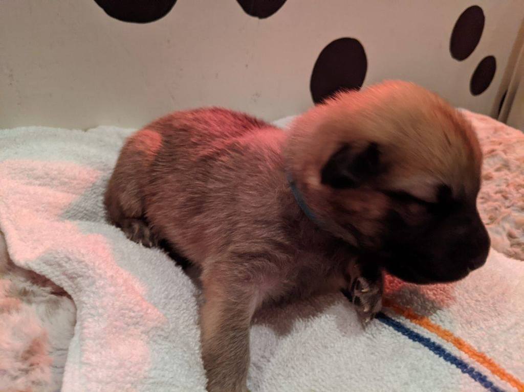 The pups continue to have good weight gains and Bona is being such a good mom. They are increasing their play with each other and are more interested in toys all the time. They are playing hard, then sleeping a lot. They have just been introduced to goats milk and are figuring out that new experience.