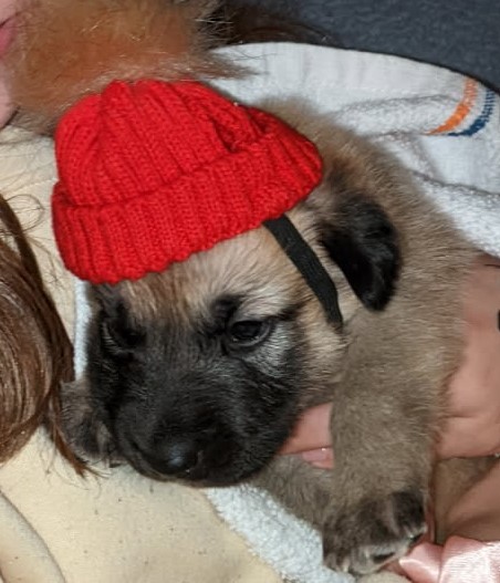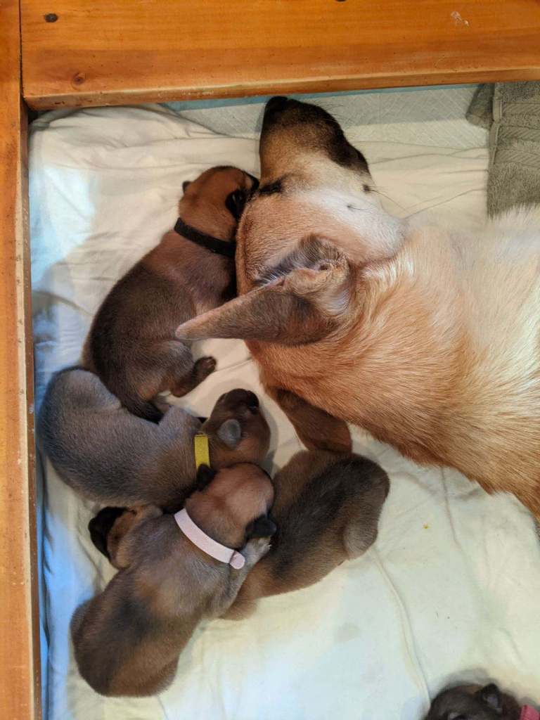 The pups have graduated to eating gruel, though, they still love momma’s milk. They are starting to grow by leaps and bounds. Christmas preparations and celebrations have kept their human family very busy, so the update is a few days late this week. They also protested having to deal with a substitute photographer this round and did not want to sit still, except for Pattie (good girl!). That did not diminish their cuteness, however.
