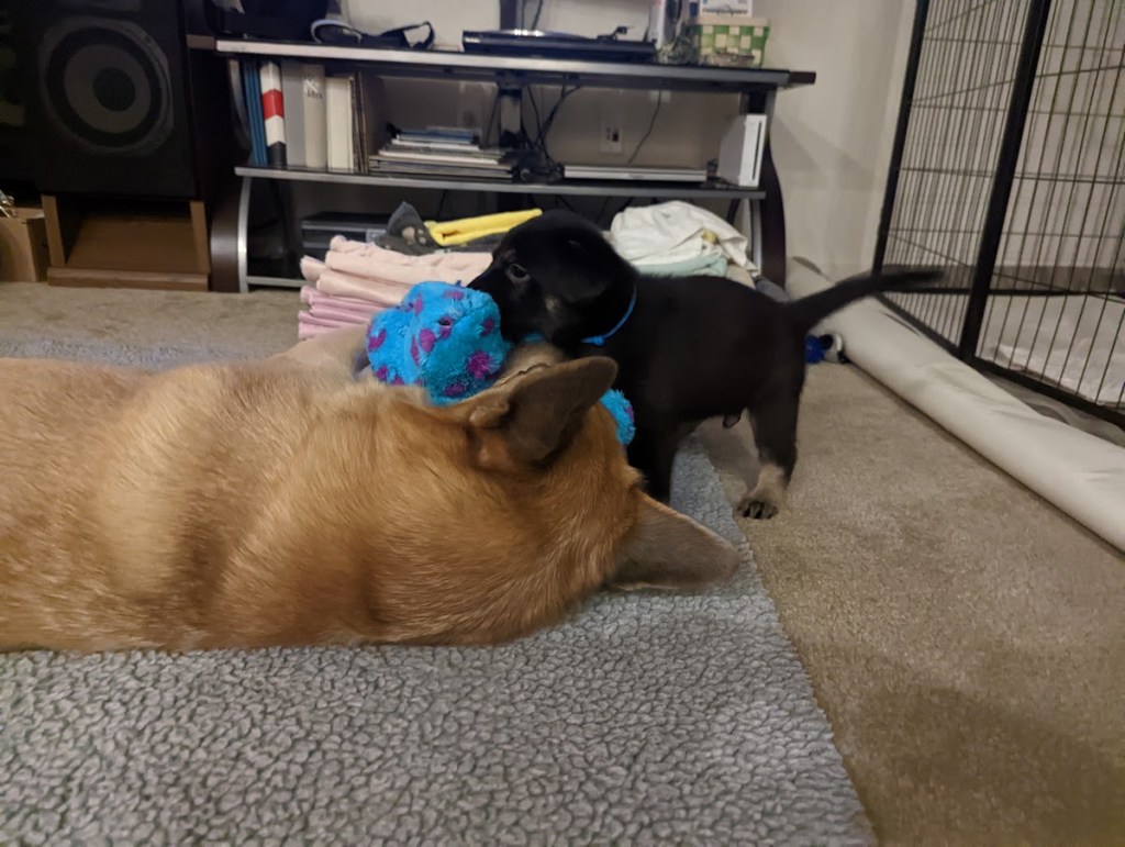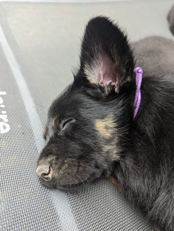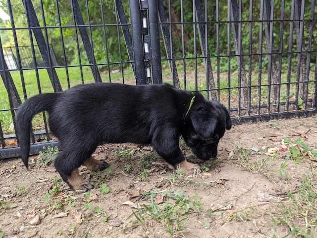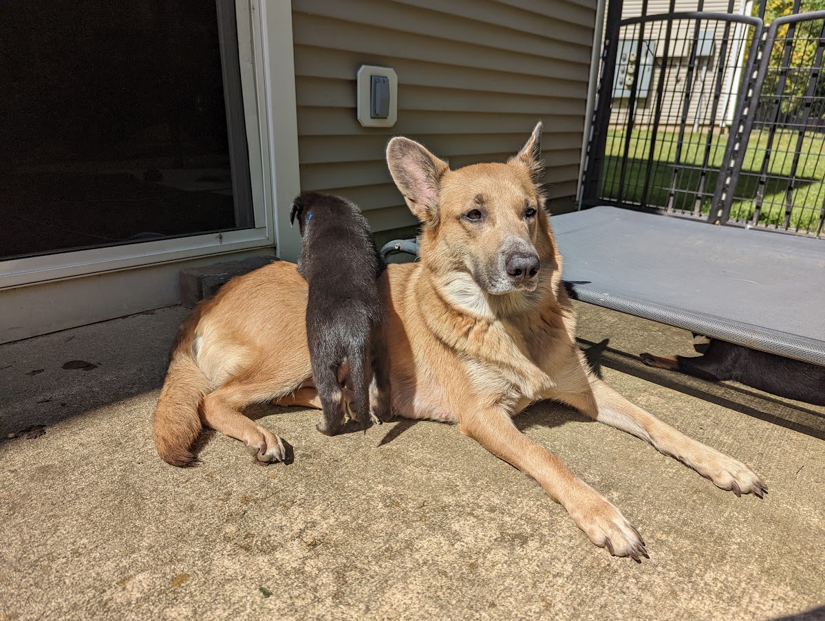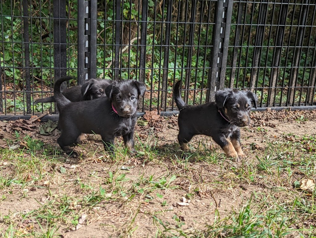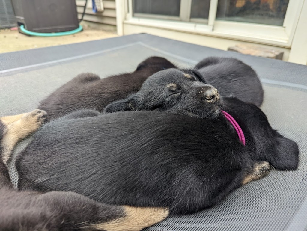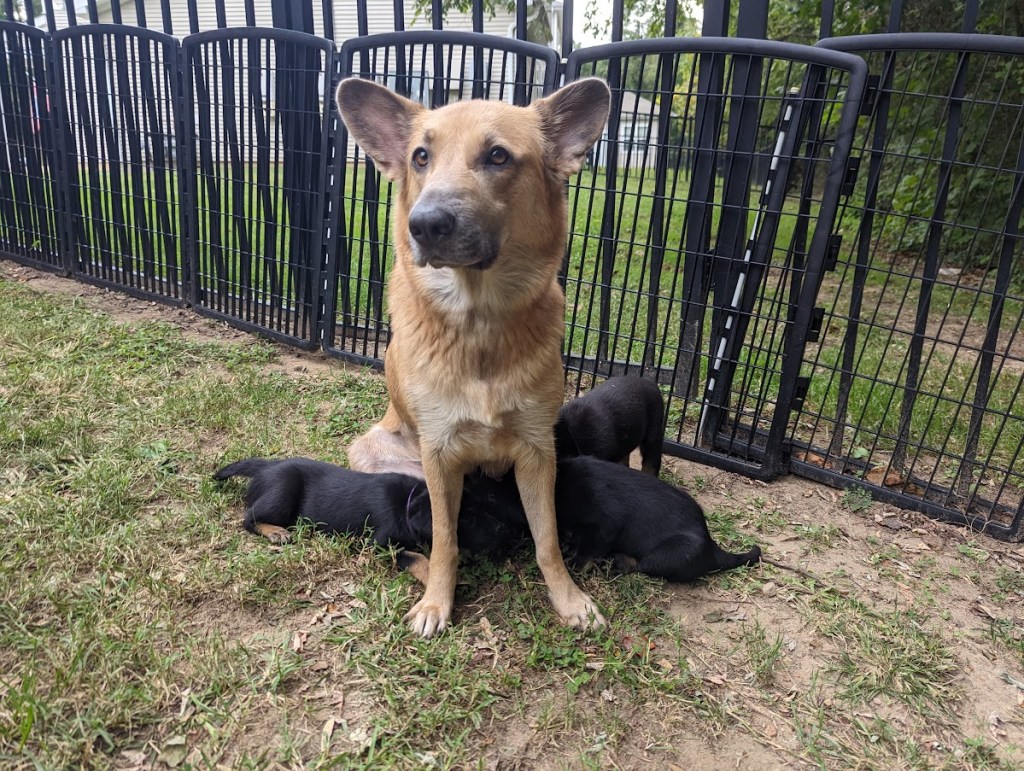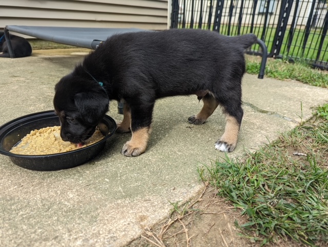 These puppies are having a blast in their outdoor space and expanded indoor area. They got to experience a bit of rain today, which made digging in the dirt that much more fun! They keep jostling for position on the weight chart, keeping us guessing as to where each will land. They are enjoying softened kibble but still really enjoy a meal at mom’s milk bar. How Willow puts up with those sharp teeth is anyone’s guess. She is a real trooper!
