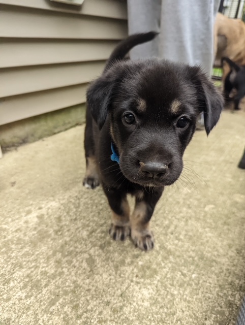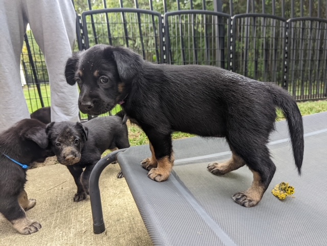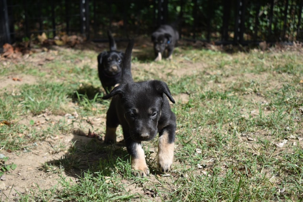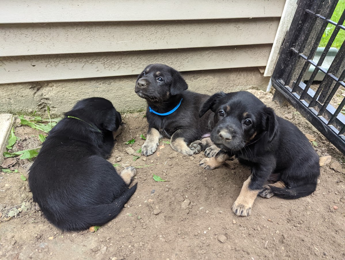 I got to visit these sweet puppies over the weekend. They are everything I expected them to be, solid and affectionate. They were unfazed by the rain and still spend plenty of time outside. They are doing a great job interacting with all of their visitors, large and small. They are learning to come running when called, and it is fun to see the whole pack dash over. They are alert and more and more tuned into the world that surrounds them. They are getting a lot of socializing and exposure to new things every day.
