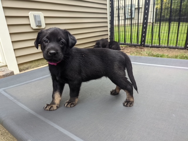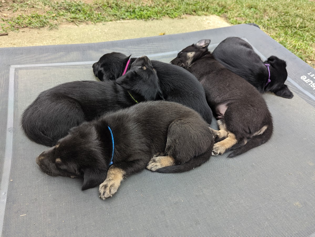 These puppies are ready to go to their homes! They have been well prepared by their human mom, and by Willow. Some of their activities have included tons of socialization with many children and adults, practice at recalls, potty training, sitting on command, grooming, and getting used to loud and unexpected noises. They have done really great with learning to walk on leash and having time away from their siblings. In fact, they all cry until they get their turn at the leash walking! Blackjack left for his forever home today, but he is just a few houses away and will be back for frequent visits. The rest will go to their homes at the end of the week.