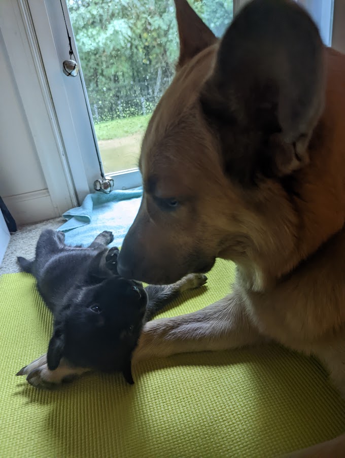 My visit and photos are from a few days ago, when they were 6 1/2 weeks old. They have grown a lot since my last visit! They are getting lots of access to the outdoors via a large deck and an even larger penned-in grassy area. They have lots of interactions with people and the adult Chinooks in the pack. It is fun to watch their exuberant play and they increasingly complex interactions with each other.